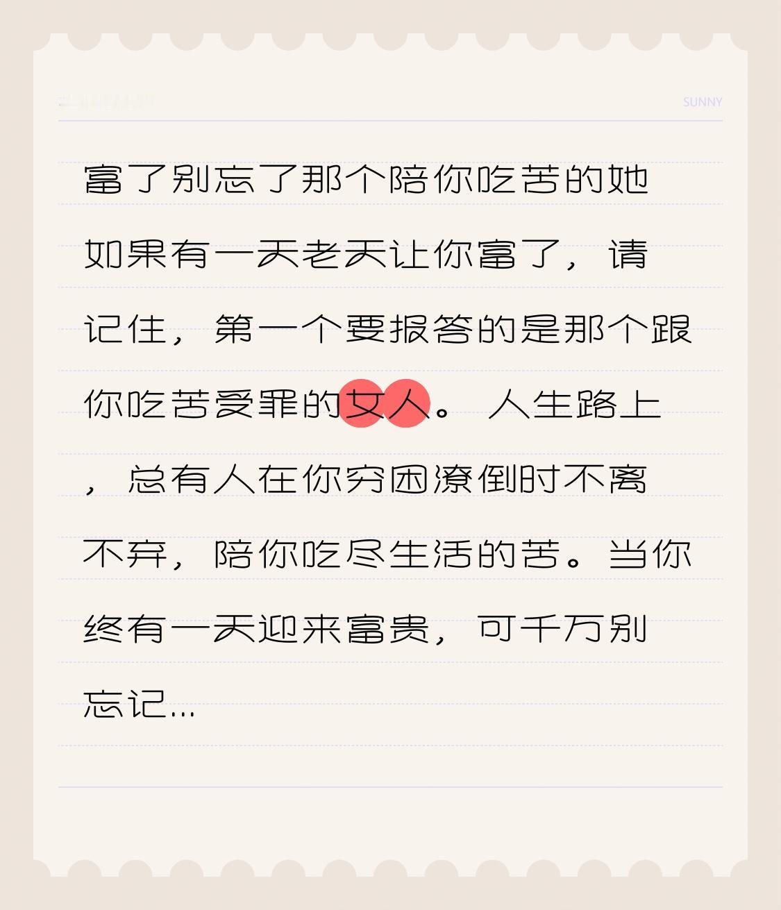 富了别忘了那个陪你吃苦的她 如果有一天老天让你富了,请记住,第一个要报答的是那个跟你吃苦受罪的女人。 人生路上,总有人在你穷困潦倒时不离不弃,陪你吃尽生活的苦。当你终有一天迎来富贵,可千万别忘记那个曾与你同甘共苦的她。 是她在你失意时给你温暖,在你拼搏时默默支持。这份陪伴与付出,值得你用往后的岁月去报答。 愿我们都能铭记那些共患难的时光,珍惜那个陪你吃苦的人,让真情在岁月中愈发珍贵。 人生感悟 感恩 情感共鸣 同甘共苦