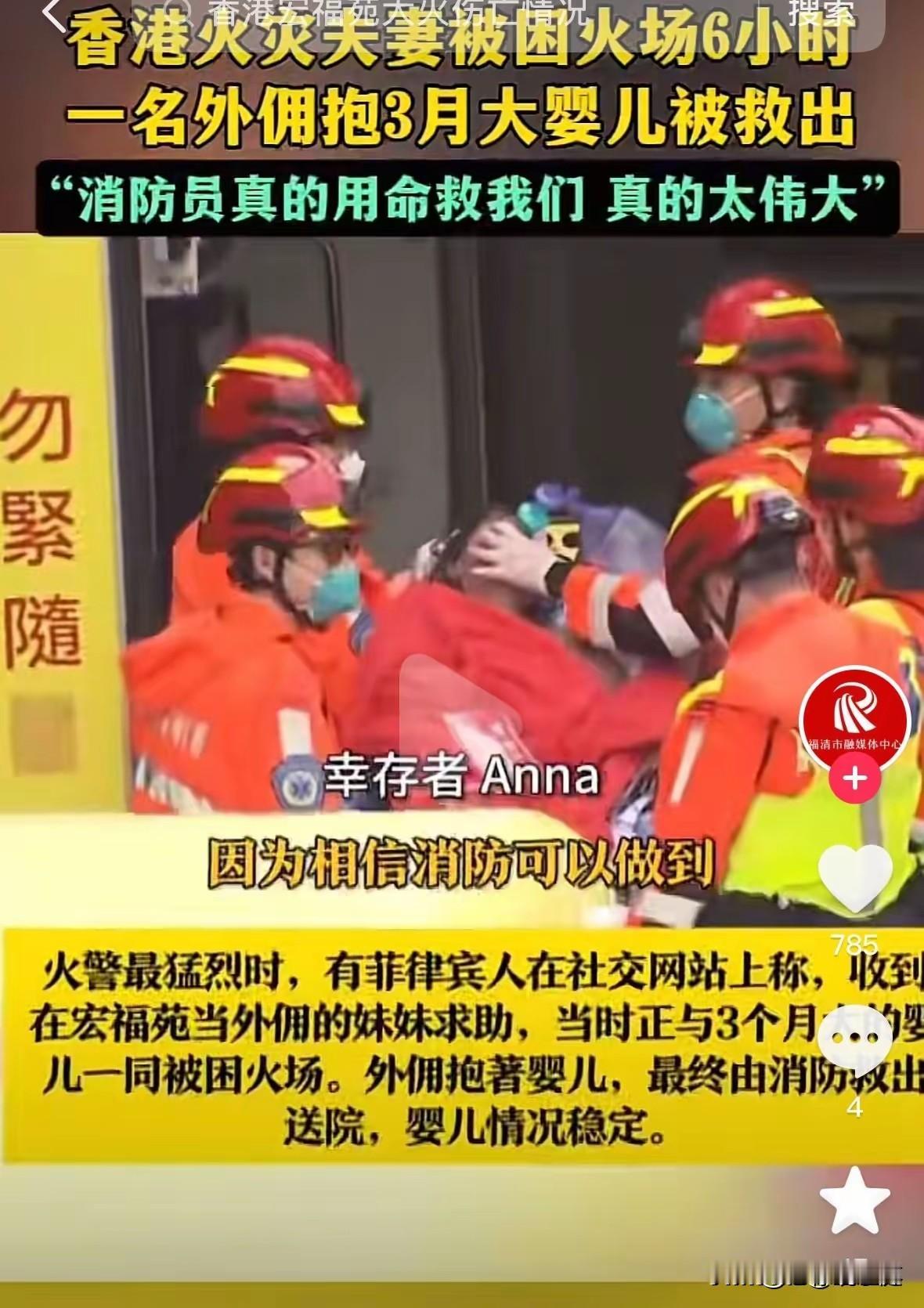 香港这位菲佣,火灾生死关头没有独自逃生,而是折返儿童房救孩子。紧紧抱着孩子把生存的最大希望留给了孩子。幸运的是双双被救。 这拯救的不只是一个孩子,更是背后的一个家庭。这是爱岗敬业,更是人性的光辉!香港救人 香港火灾自救 香港人获救 香港消防员救援 救窒息女童 消防员救孩子 高空救小孩 香港救火