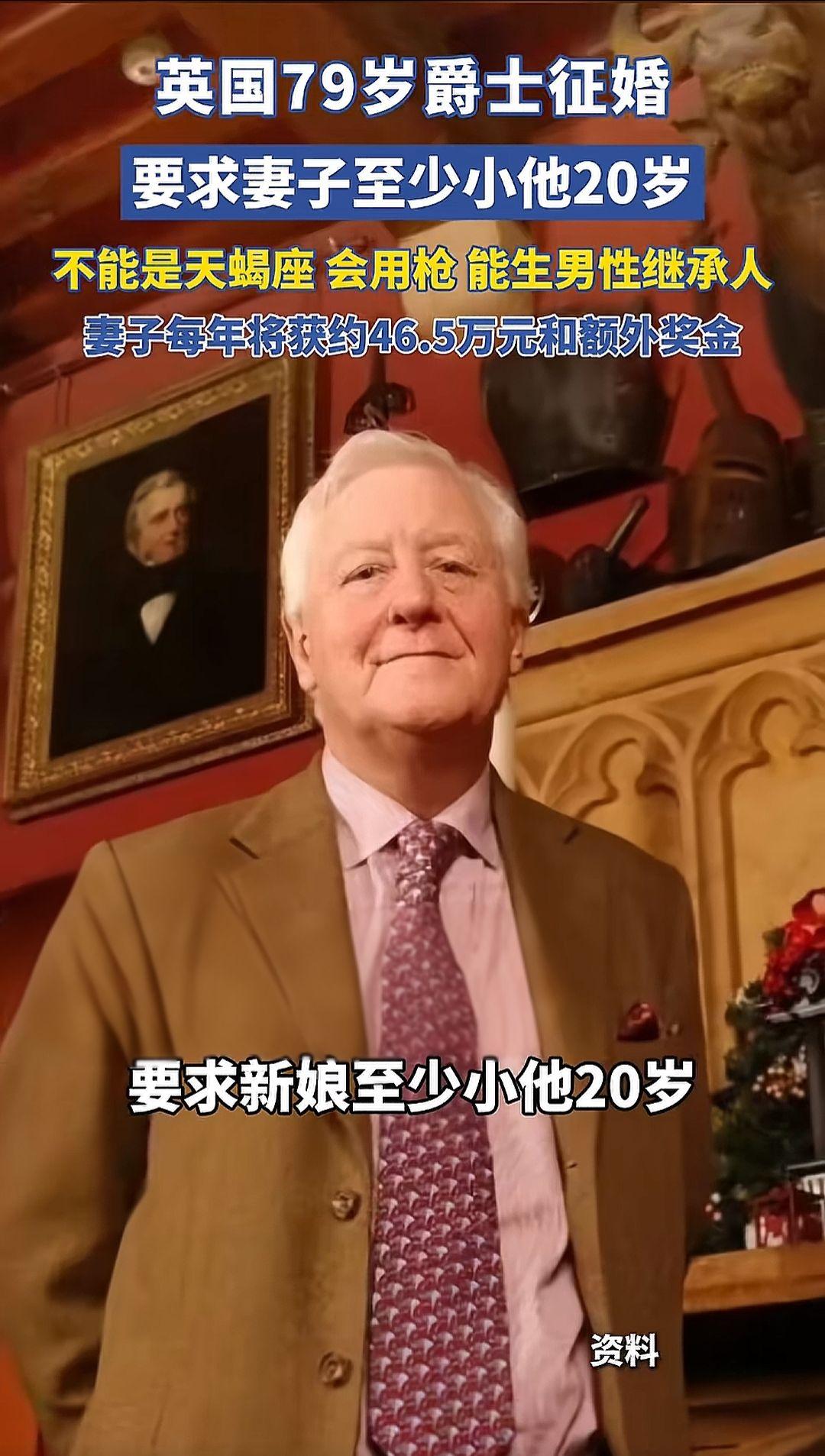 英国79岁爵士征婚,要求新娘至少小他20岁,不能是天蝎座,还得能生男性继承人