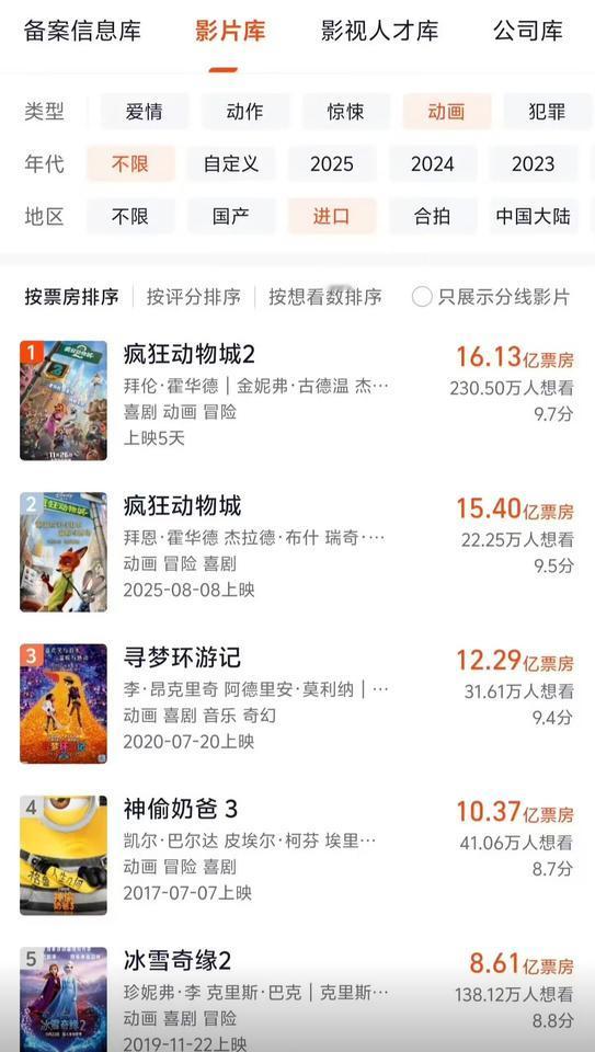 势不可挡,疯狂动物城2上映5天,累计票房突破16亿,超越了疯狂动物城1,成为了进口动画电影票房总冠军。 而且照这个架势,票房记录还得不断刷新。我个人预计可能会到40亿左右。 因为周末的时候,我去电影院看了一下,几乎场场爆满,很多小朋友带着大人一起看。 这说明什么?说明不是电影市场不景气,而是没有真正的好作品。