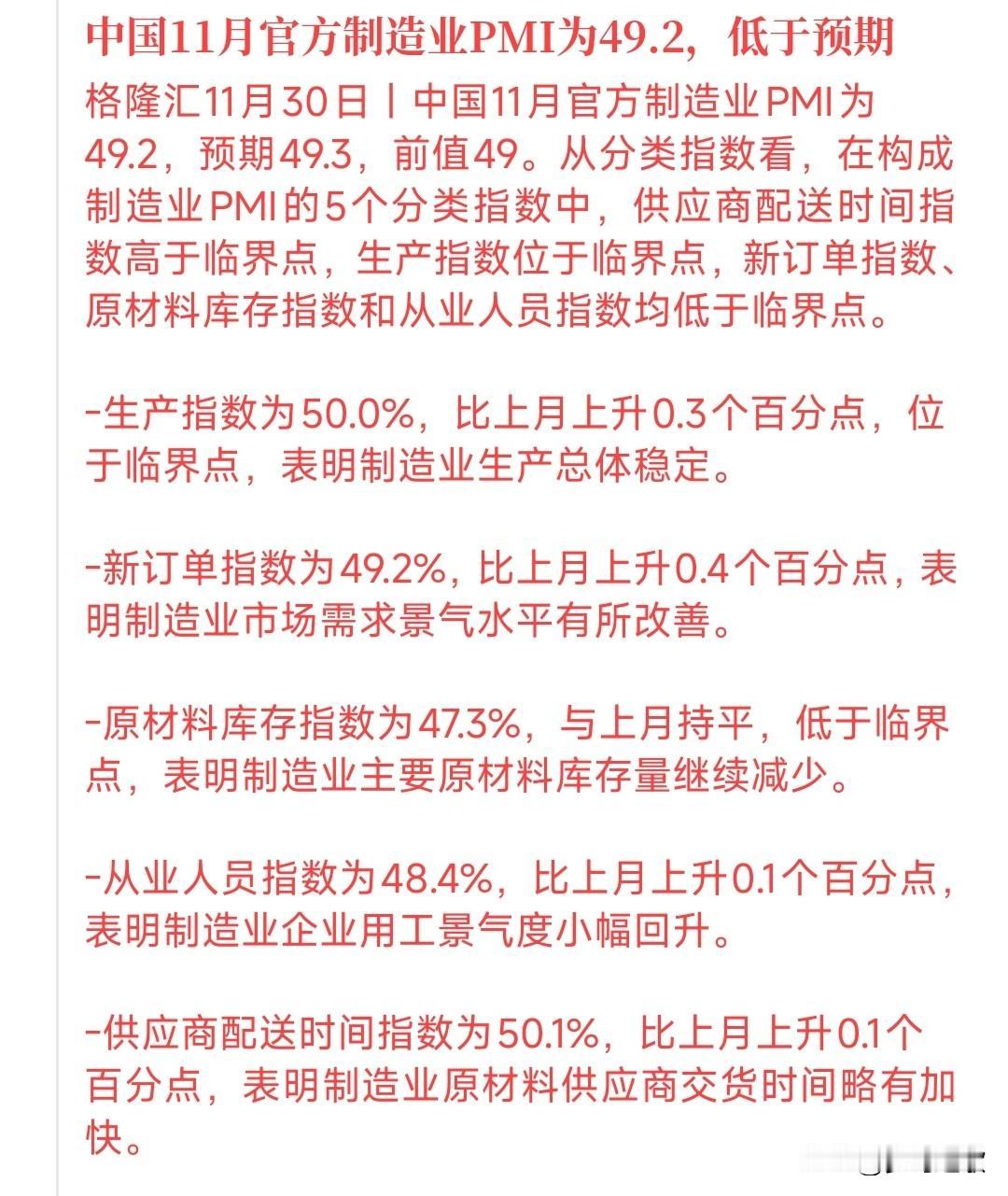 制造业指数和非制造业指数出炉,双双不及预期 从官方发布的11月制造业指数来看,PMI49.2,虽然不及预期的49.3,但是主要低于临界点的在于新订单,原材料和从业人员,但和上月相比都有所上升,并不影响制造业。 非制造业指数PMI49.5,预期50。主要就是房地产行业和居民服务等低于临界值,尤其是服务业下降的比较多,10月还是50.2,11月仅仅49.5,建筑行业相较上月还有所增加。 从以上数据基本可以看出对于制造业来说是一个利好,但对于非制造业来说是一个利空,尤其是服务业,服务业的下降主要还是因为消费行业的不景气,消费的政策可能还会有很大预期。