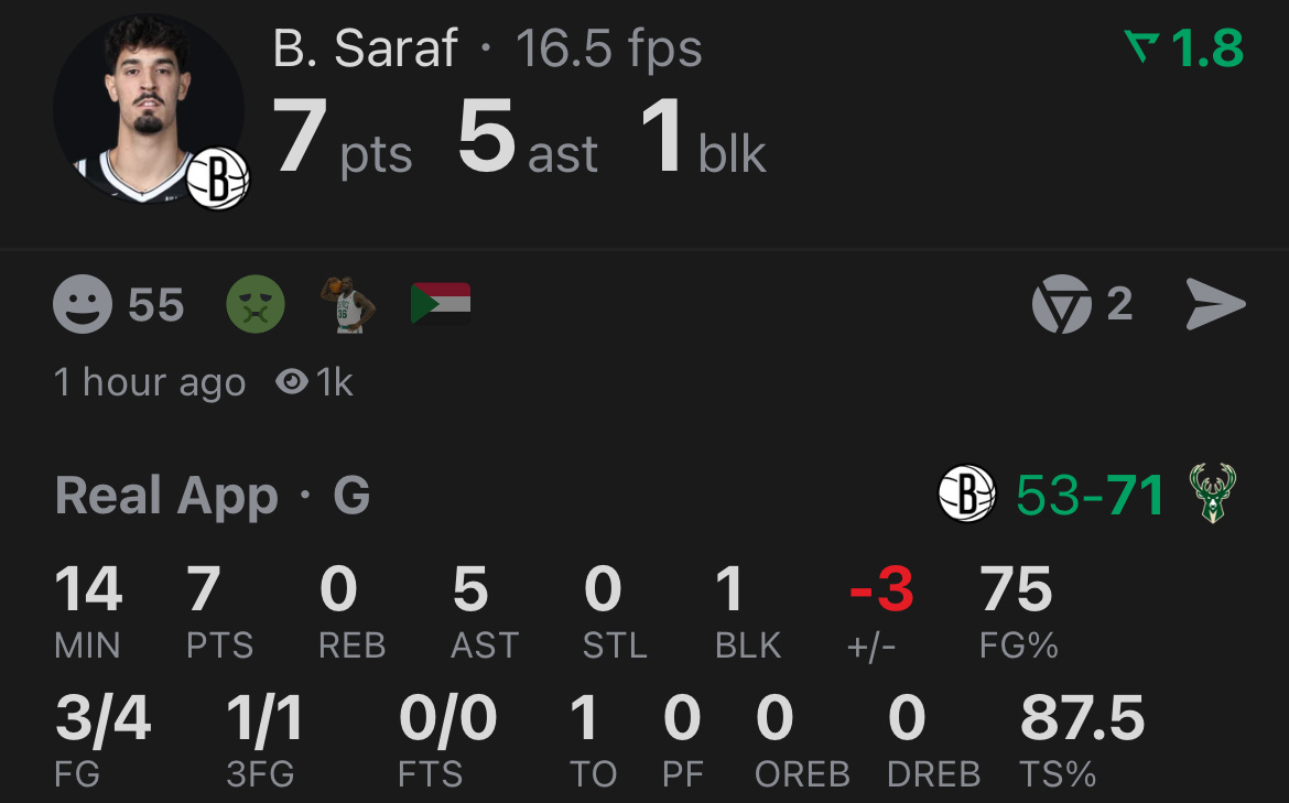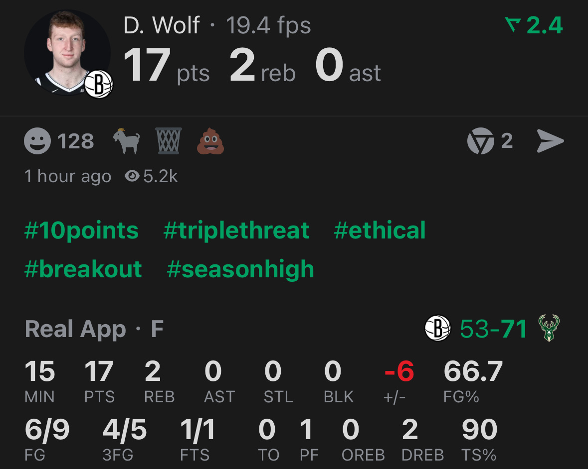 沃尔夫半场最后时刻投丢了个人今天第一个三分,17分2篮板。萨拉夫半场7分5助攻1失误。不白练级!篮网vs雄鹿NBA