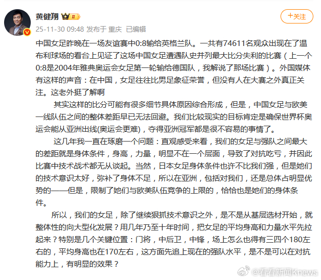 【#黄健翔称女足与强队差距无法回避#】11月30日,发文谈#中国女足0比8英格兰女足#。他指出,这是队史并列最大比分失利,并与2004年解说过的0:8负于德国队并列。外国媒体认为在中国女足虽象征荣誉,但大赛之外无人真正关注。他表示,中国女足与欧美一线队的整体差距已无法回避。直观感受是身体条件(身高、力量)明显不在一个层面,导致对抗吃亏,技战术无从谈起。日本女足靠技术意识弥补身体不足,但身体也限制了其与欧美竞争的上限。因此他提出,女足是否应从基层选材开始,整体性向大型化发展,用几年乃至十年时间提升平均身高和力量水平。