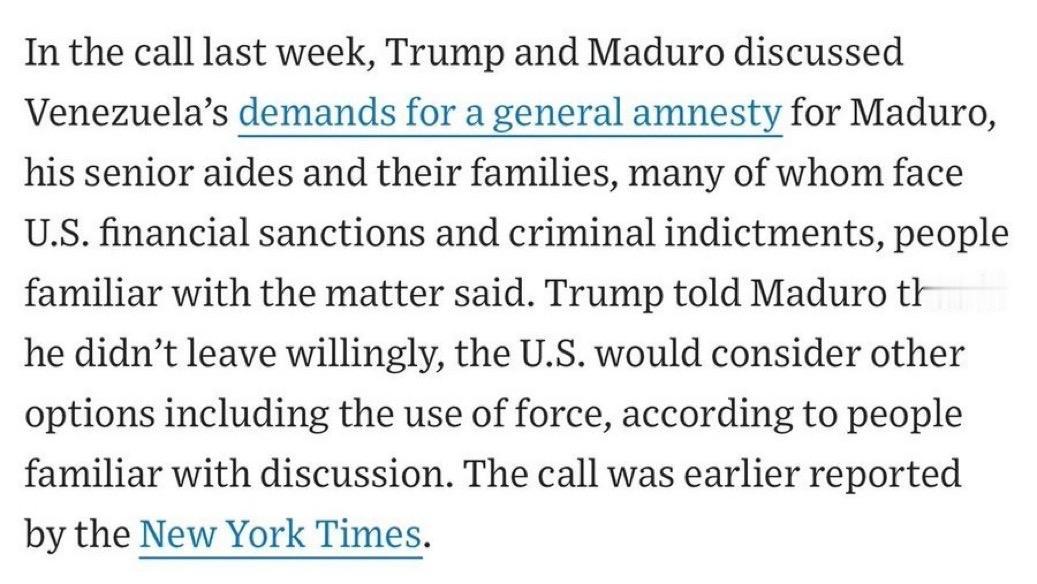 据《华尔街日报》援引消息人士报道,唐纳德·特朗普在一次电话通话中告诉委内瑞拉领导人尼古拉斯·马杜罗,如果他不自愿下台,华盛顿可能会考虑使用武力