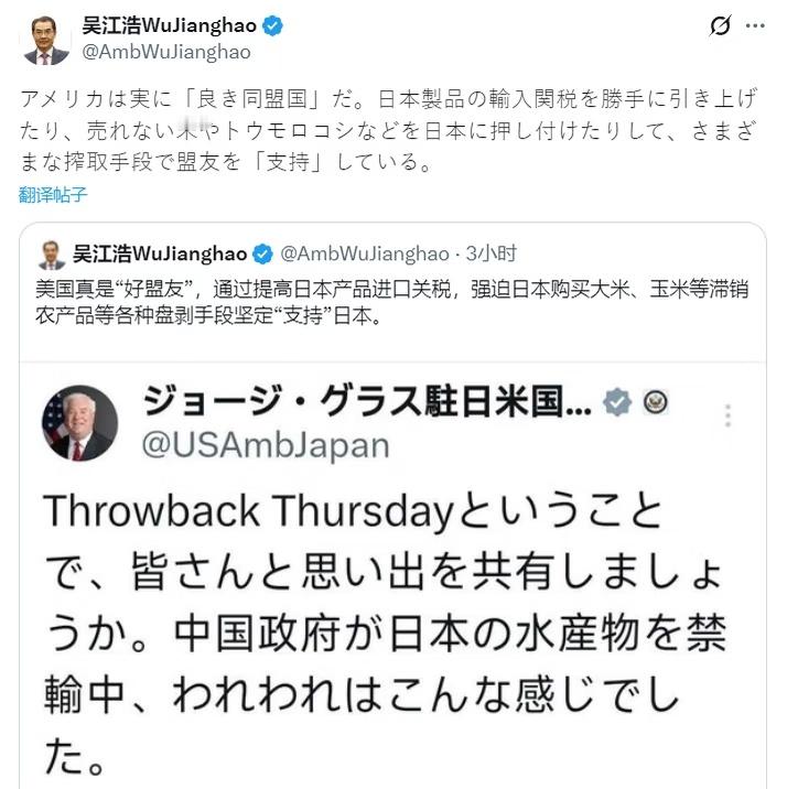 中国驻日本大使发声看到大使之前的发言,日本人视角可能是:有了美国粮食,就可以摆脱中国进口了,这充分体现了美国对日本的“无条件”支持,简直就是雪中送炭
