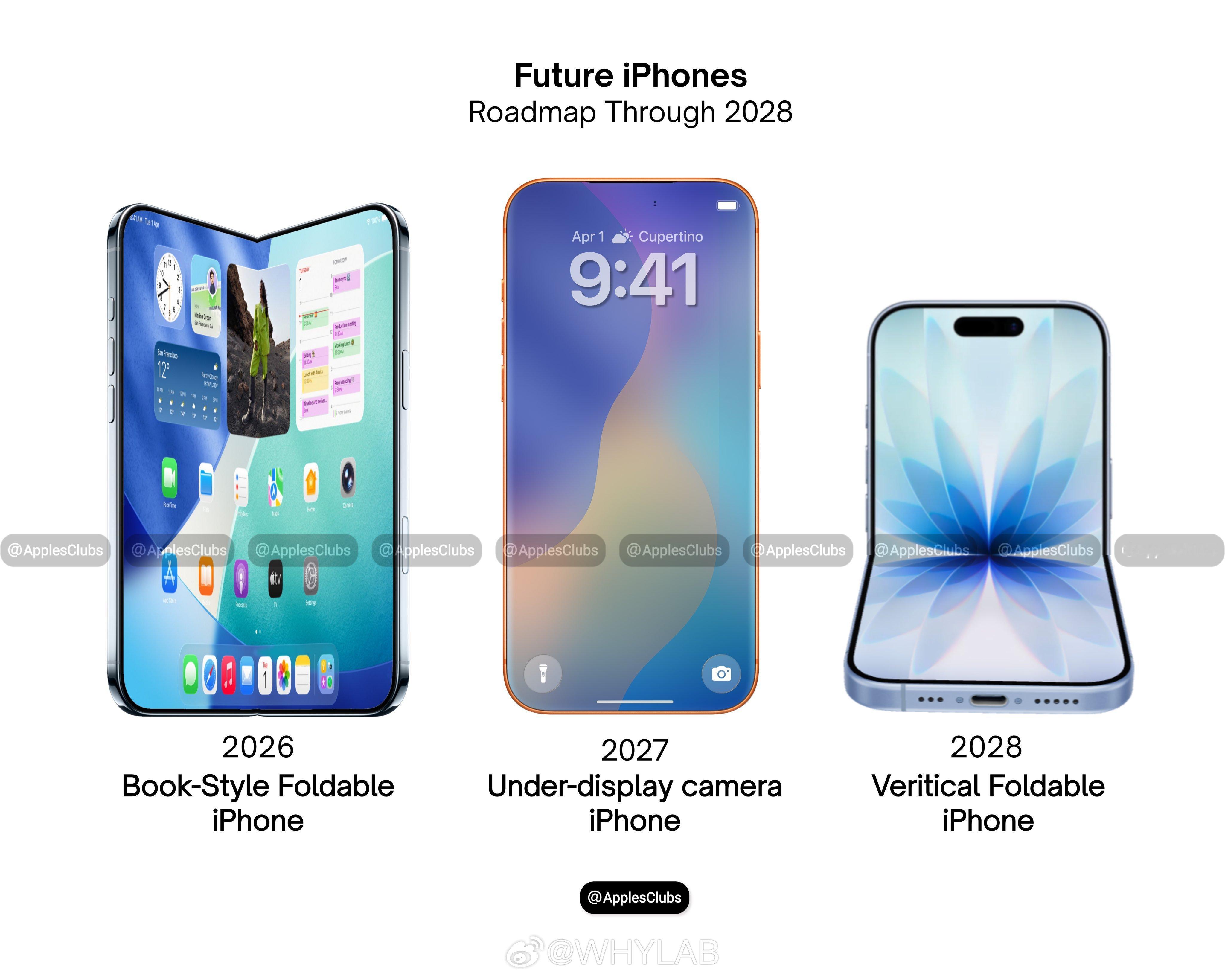 苹果接下来三年的新品发布节奏,2026 年 iPhone 首款大折叠,2027 全面屏 iPhone,2028 年 iPhone 小折叠(可能)。