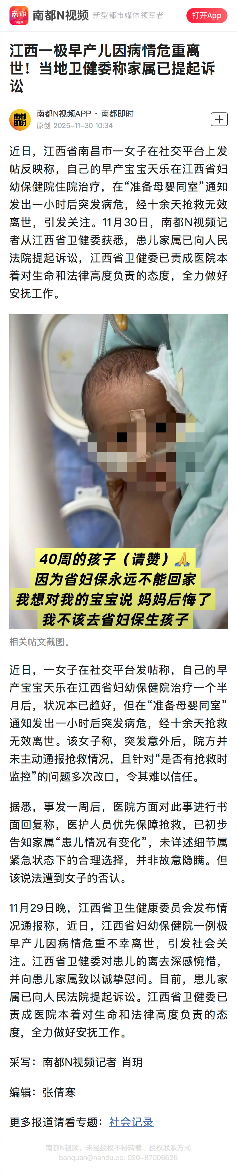 #江西一极早产儿病情危重离世#【江西一极早产儿因病情危重离世!当地卫健委称家属已提起诉讼】#江西极早产儿不幸离世家属起诉##江西卫健委回应极早产儿离世事件#近日,一女子在社交平台发帖称,自己的早产宝宝天乐在江西省妇幼保健院治疗一个半月后,状况本已趋好,但在“准备母婴同室”通知发出一小时后突发病危,经十余天抢救无效离世。该女子称,突发意外后,院方并未主动通报抢救情况,且针对“是否有抢救时监控”的问题多次改口,令其难以信任。据悉,事发一周后,医院方面对此事进行书面回复称,医护人员优先保障抢救,已初步告知家属“患儿情况有变化”,未详述细节属紧急状态下的合理选择,并非故意隐瞒。但该说法遭到女子的否认。11月29日晚,江西省卫生健康委员会发布情况通报称,近日,江西省妇幼保健院一例极早产儿因病情危重不幸离世,引发社会关注。江西省卫健委对患儿的离去深感惋惜,并向患儿家属致以诚挚慰问。目前,患儿家属已向人民法院提起诉讼。江西省卫健委已责成医院本着对生命和法律高度负责的态度,全力做好安抚工作。南都N视频记者 肖玥