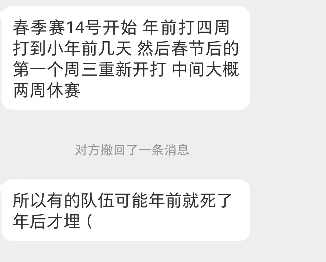 明年春季赛如果是14号开始,年前打一轮,打到2月1号,大概是这样