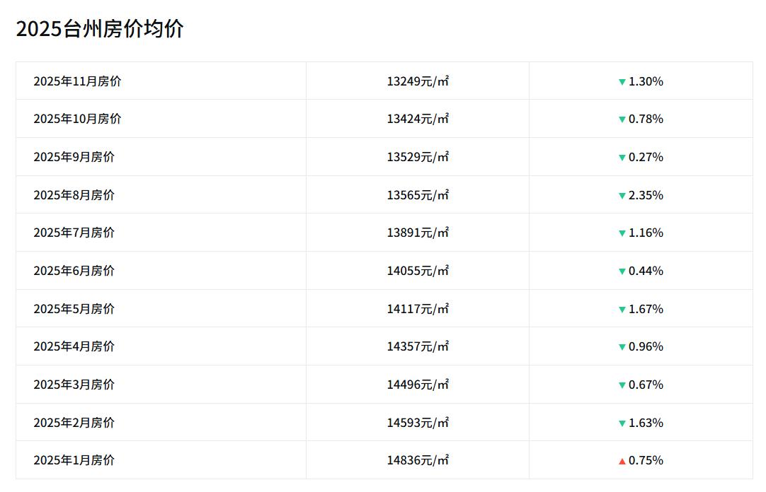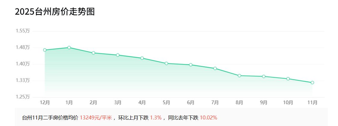 2015年11月,浙江台州二手房房价均价7500元; 2016年11月,浙江台州二手房房价均价10147元; 2017年11月,浙江台州二手房房价均价11934元; 2018年11月,浙江台州二手房房价均价13484元; 2019年11月,浙江台州二手房房价均价14948元; 2020年11月,浙江台州二手房房价均价15696元; 2021年11月,浙江台州二手房房价均价16998元; 2022年11月,浙江台州二手房房价均价18001元; 2023年11月,浙江台州二手房房价均价17010元; 2024年11月,浙江台州二手房房价均价14724元; 2025年11月,浙江台州二手房房价均价13249元。 2015年,台州二手房均价还在7500元,随后全国楼市在政策松绑和货币宽松的双重刺激下,正酝酿着一场风暴。台州,这座制造业重镇,也悄然站上了风口。 随后六年,台州市的市民们亲眼见证了一条几乎笔直向上的增长曲线,六年内,二手房均价累计涨幅达127%。 2022年是台州房价的历史最高点,同时也是拐点,随后三年,房价开始下跌,几乎回归到2018年的水平。 台州楼市的这轮调整,是内外因素共同作用的必然结果,漫心r总结有以下几点原因: 1、前六年127%的涨幅,早已将本地刚需和改善群体的购买力透支殆尽; 2、房价只涨不跌的预期被打破后,房子的金融投资属性逐渐褪色; 3、过去几年的土地供应和新房开发,积累了大量的存量房源; 4、受全国周期影响,当一二线核心城市都进入调整期时,三四线城市受到的冲击往往更大、更持久。 站在2025年的当下,我们必须清醒地认识到,那个普涨、暴赚的时代已经一去不复返,市场正在回归居住本质。 台州二手房房价这十年的变迁,像极了我们的人生,有起有落。它启示我们,任何市场都有内在规律,没有只涨不跌的神话,对于真正的居住者而言,市场的回归或许不是坏事,它让我们能更从容、更理性地安放我们对家的向往。