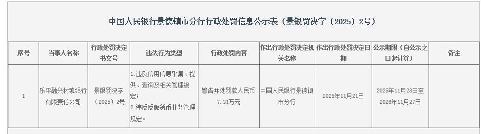 中国经济网北京11月30日讯中国人民银行景德镇市分行近日公布的行政处罚信息公示表(景银罚决字〔2025〕2号)显示,乐平融兴村镇银行有限责任公司违反信用信息采集、提供、查询及相关管理规定;违反反假货币业务管理规定。中国人民银行景德镇市分行对其警告并处罚款人民币7.31万元。