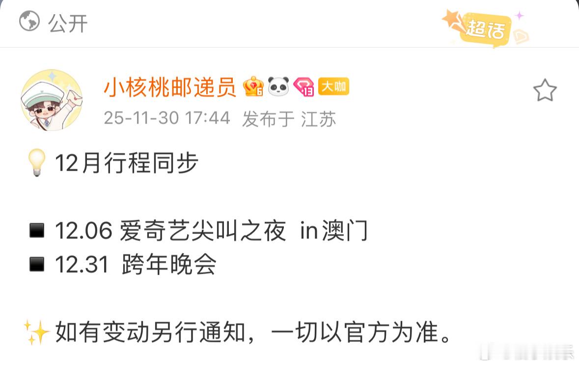张凌赫十二月行程来了,12.06 参加爱奇艺尖叫之夜,12.31有跨年晚会,年末多多见面吧!期待!
