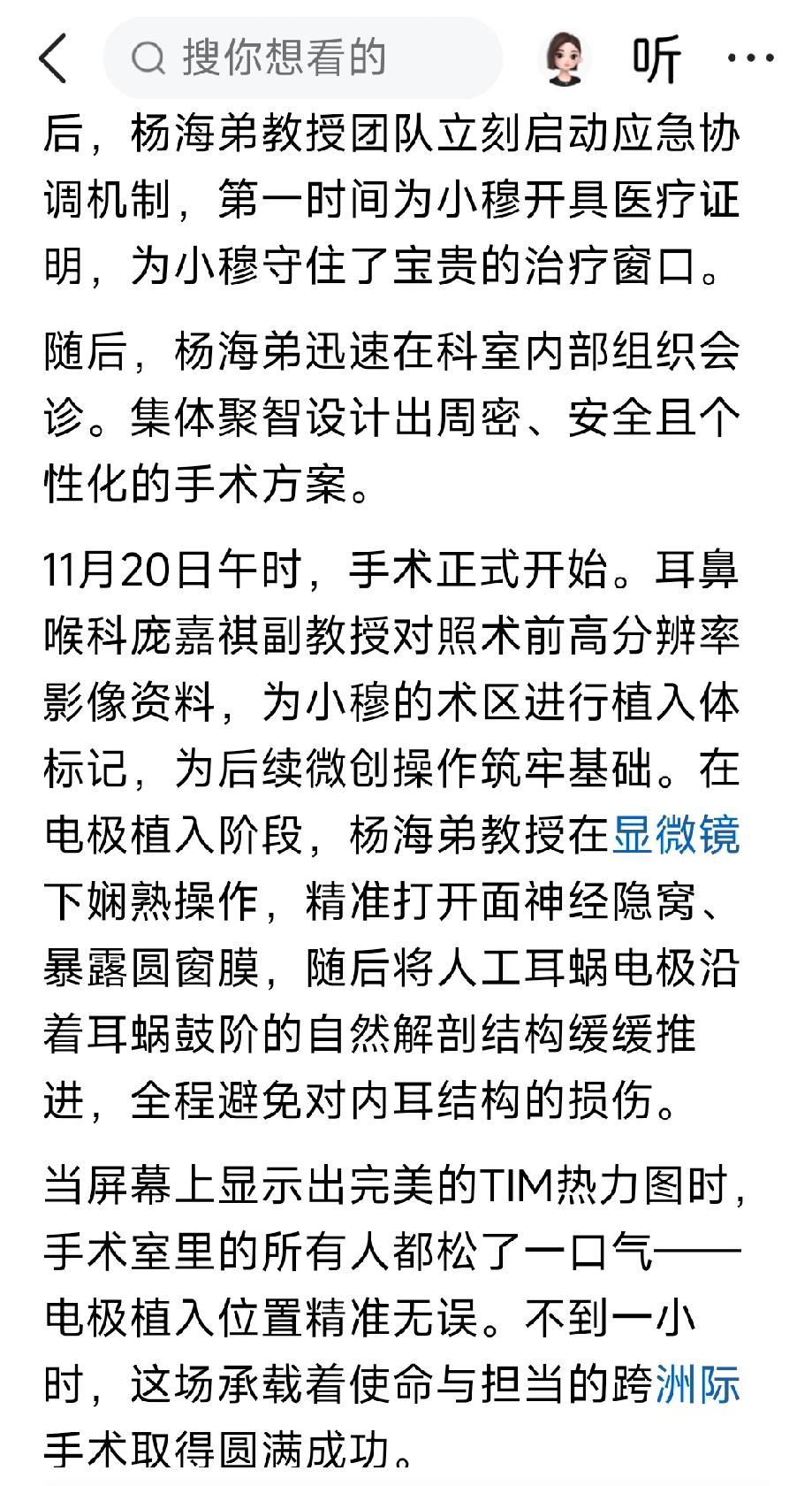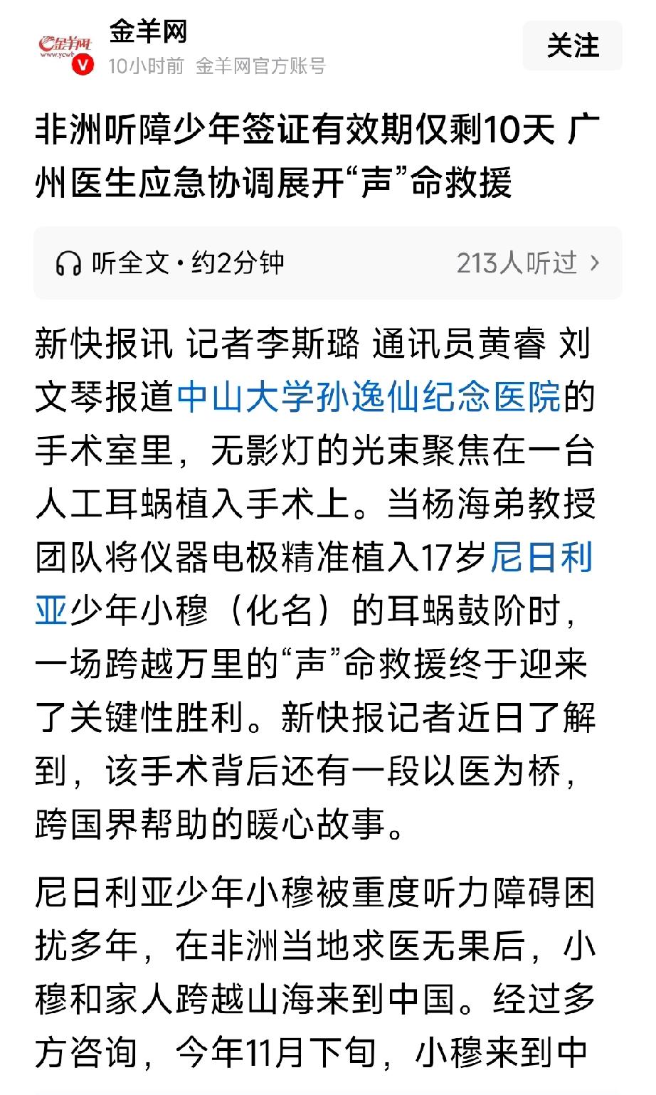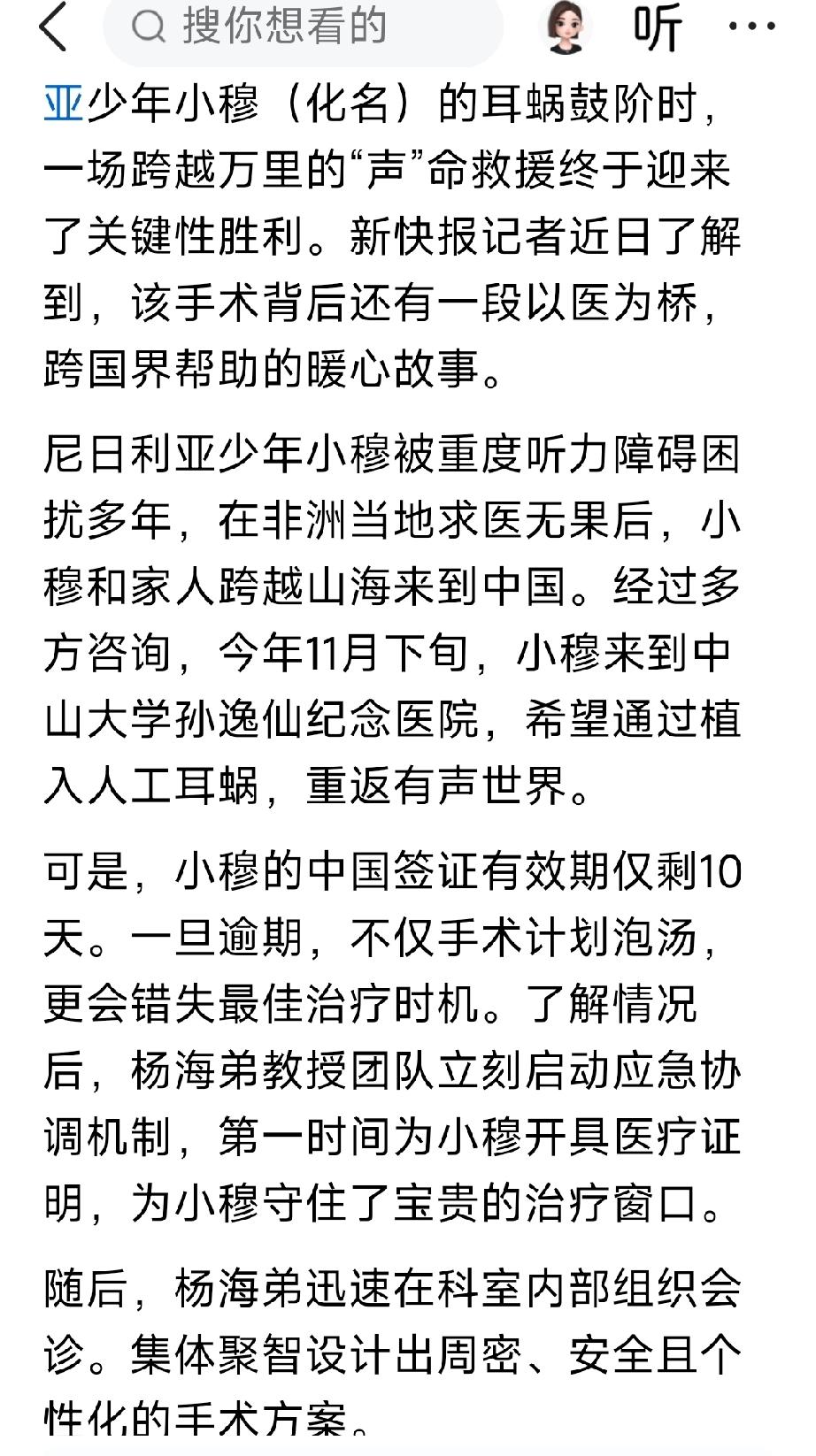 恭喜!恭喜!非洲尼日利亚17岁少年小穆。多年来,他饱受重度听力障碍的折磨,在非洲当地四处求医却毫无结果,随后不远万里来到中国。他来到中山大学孙逸仙纪念医院,接受人工耳蜗植入手术。不到一小时,这场肩负使命与担当的跨洲际手术便圆满成功。