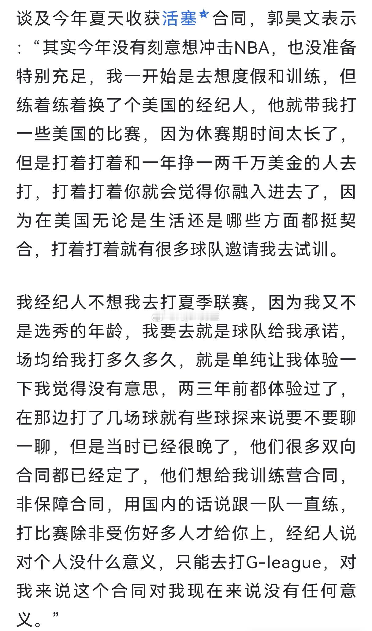 郭昊文自己承认活塞给了他训练营合同,但他觉得没有任何意义。我丝毫不怀疑这个合同的真实性,郭昊文没必要撒这个谎,他每年休赛期都会去美国度假训练,同时和一些NBA球星打野球局,之前看过一些郭昊文在这样的球局中的视频,确实有不错的发挥,虽然对面的NBA球员并没有使出全力防守,但毕竟都是NBA的主力轮换球员甚至是全明星球员,整体强度在这摆着,所以郭昊文的发挥能让球探给出合同也在情理之中。郭昊文作为00届的国青核心,在U19世青赛上拿过赛事历史上为数不多的三双(其实是四双,失误也上双了),当时获得了包括冈扎加大学在内众多NCAA强校的offer,但他依然选择从八一队开始自己的职业生涯,虽然后来在八一队经历了那件事,但他并没有放弃对NBA梦想的追逐,2022年他和张镇麟、曾凡博一起征战夏季联赛,才有了图三的名场面,但很遗憾,三人都没能留下,但郭昊文并没有完全放弃,当即决定留在G联赛打一年继续冲击,然而命运给了他重重一击,在赛季开始前的训练中重伤导致赛季报销,彻底失去了追梦NBA的动力和能力,伤愈复出后就回到了CBA的温室。虽然这次活塞只是给了训练营合同,这是多少球员为之奋斗一生而求之不得的,但郭昊文竟然在自己25岁正值一个篮球运动员最好职业生涯时期,以没有任何意义为理由拒绝了?!这足以说明他现在已经完全没有了向上奋斗的心气。而他这两年的球技,也像他的心气一样变得平庸且无亮点。当然,我们作为球迷不能道德绑架球员的梦想,有人追其一生都想打进NBA,而有人就喜欢钱多事少离家近哪怕被NBA选中也不愿去踏足尝试,所以对我们球迷来说,能做的只有尊重和表示遗憾,但对中国篮球的发展来说却是一个损失。CBA中国男篮