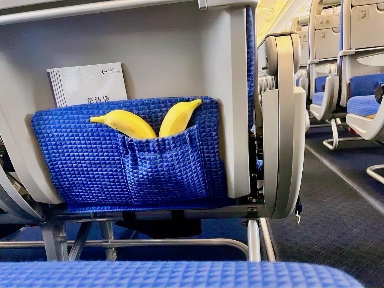 画面采取左七右三的结构, 黄色的香蕉和蓝色的口袋, 组成了左边70%的画面重心。 右边的过道, 提供了画面的整体深度。 画面最下方的座椅边,提供了画面层次,视角代入感和窥感。 香蕉黄,深海蓝,宁静灰, 浑然天成的色彩搭配冲击, 靜静的凝视会带来内心的平静