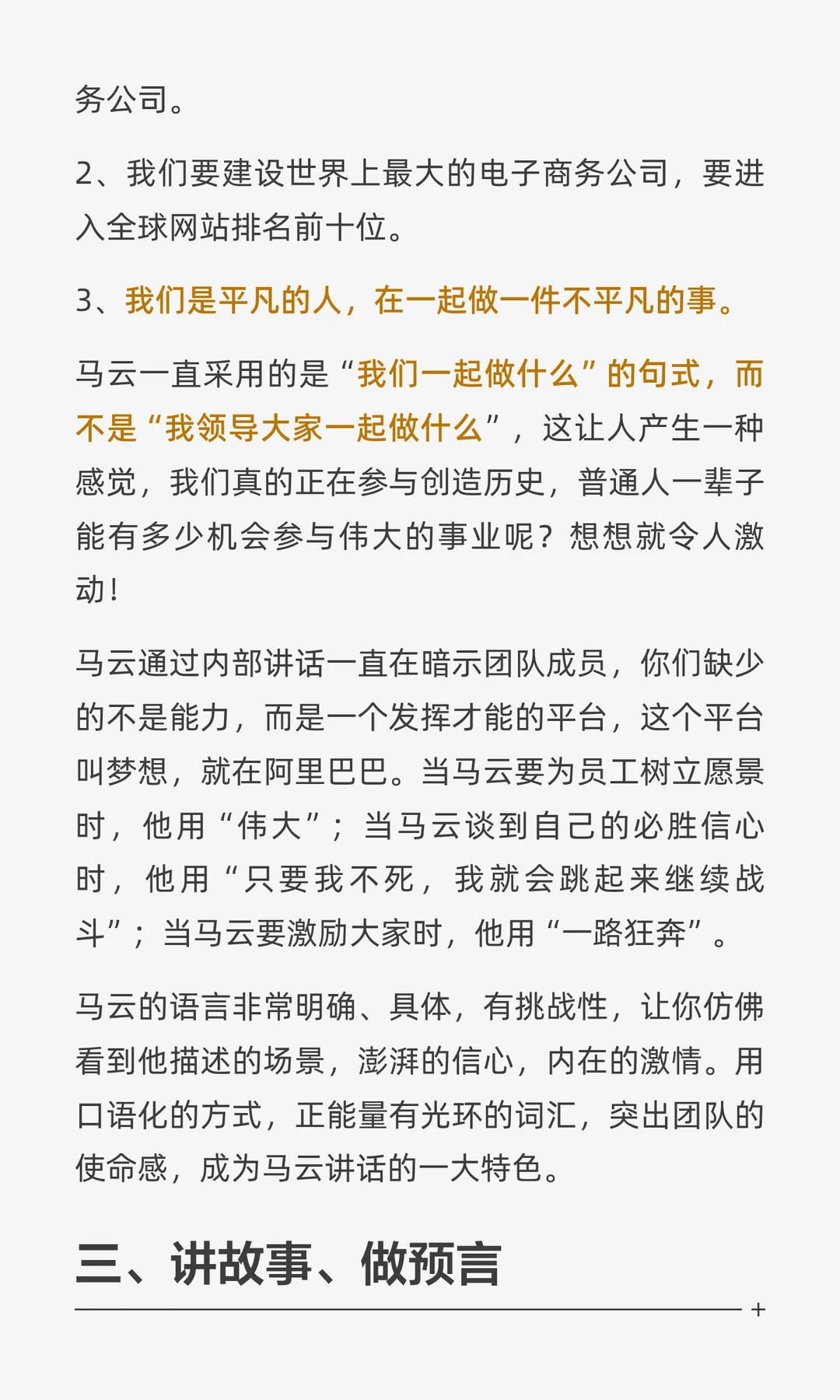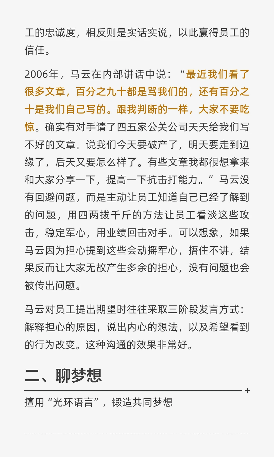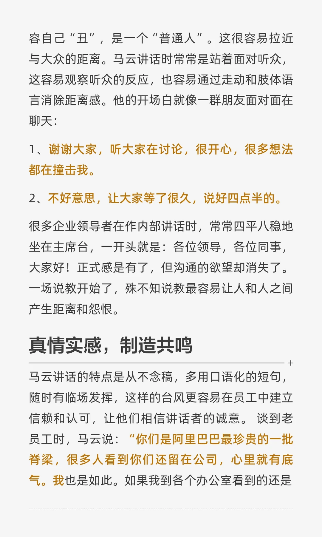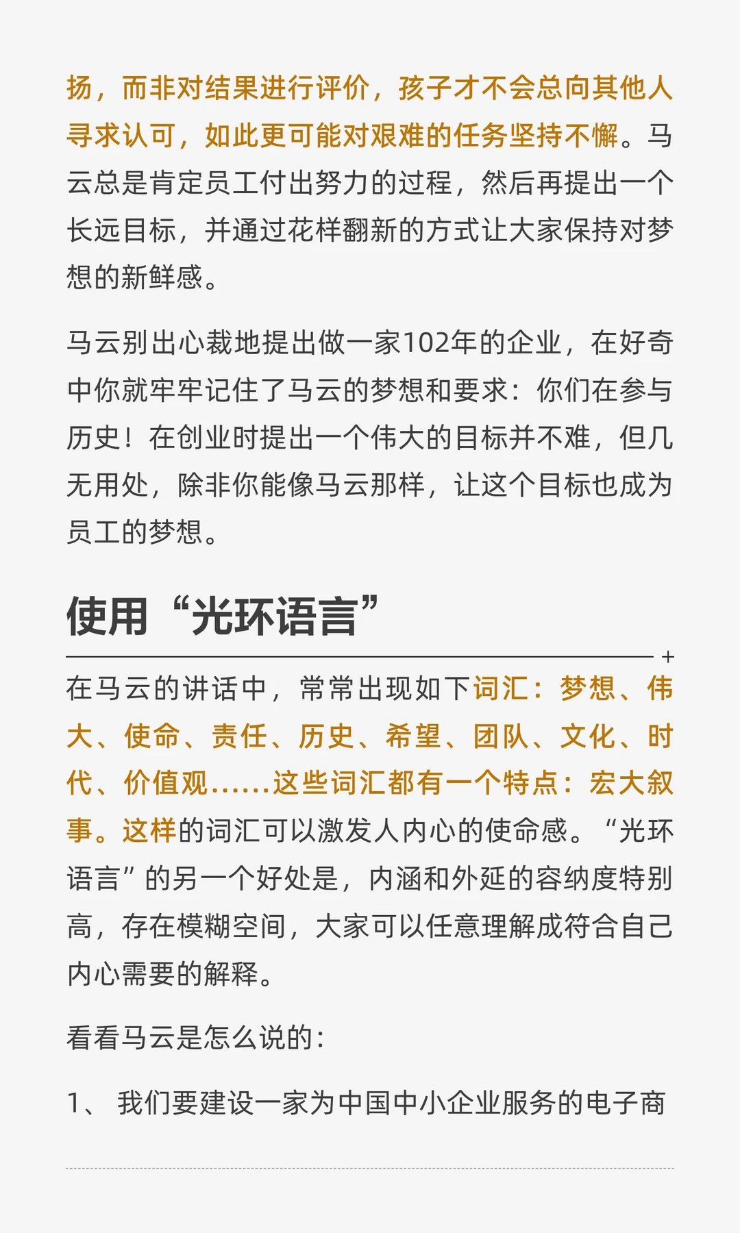马云的内部讲话以情感共鸣、梦想激励和故事讲述为核心,通过幽默与真诚建立信任,激发团队激情。 他巧妙运用“光环语言”和“光环词汇”,打造共同梦想,强调价值观与使命感,成为创业型企业的精神支柱。 一句话,将心交给人。