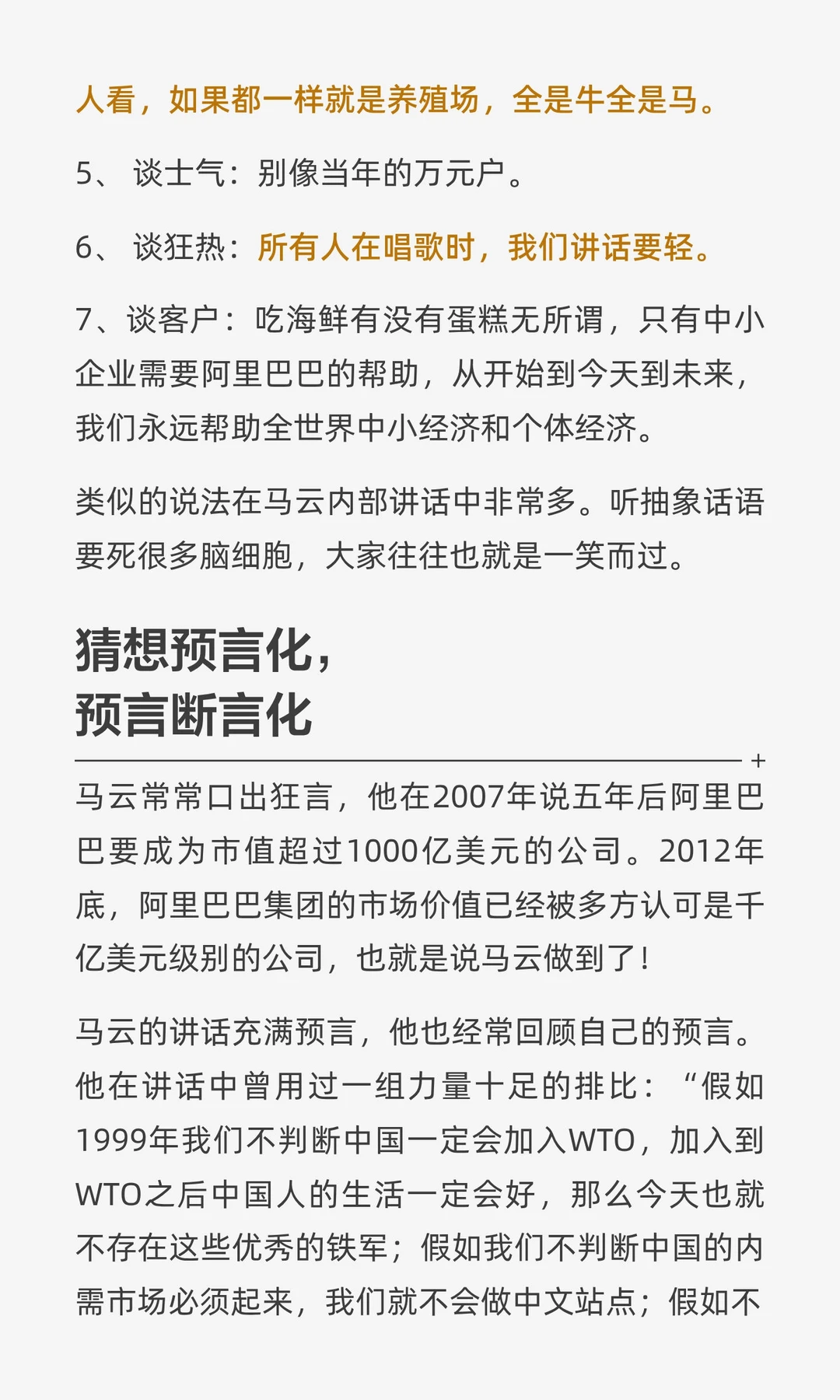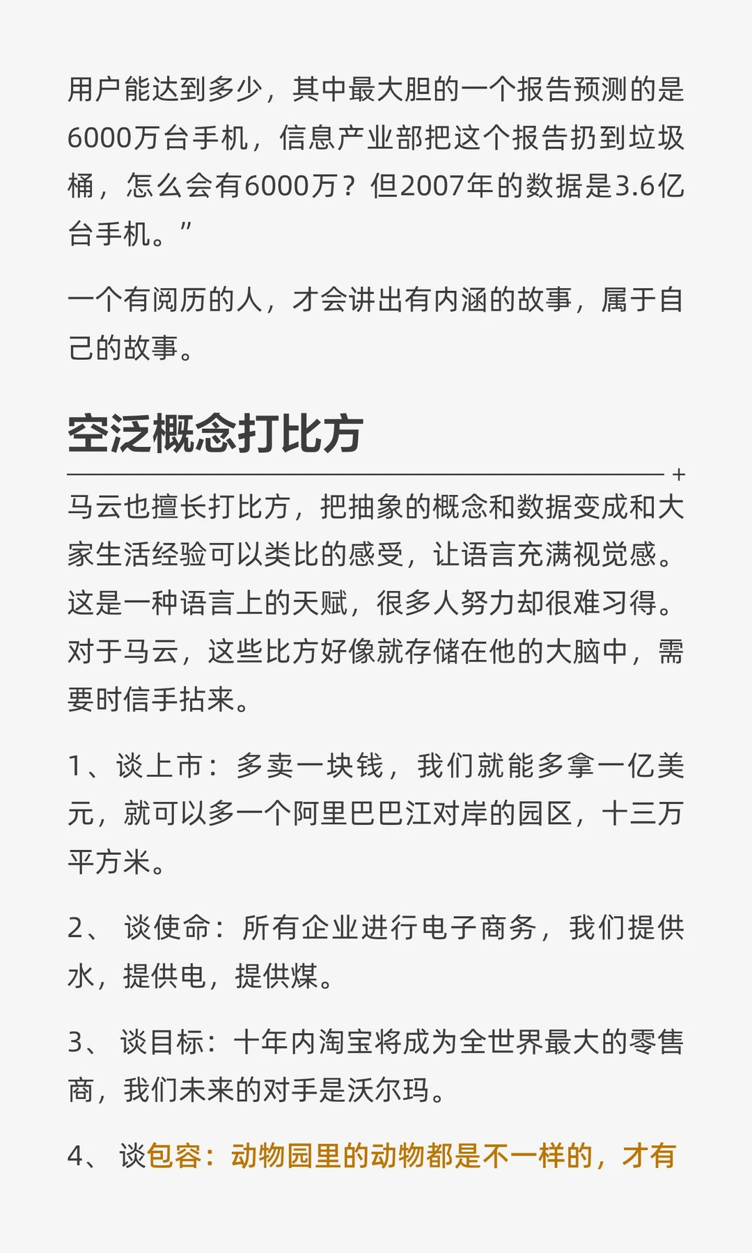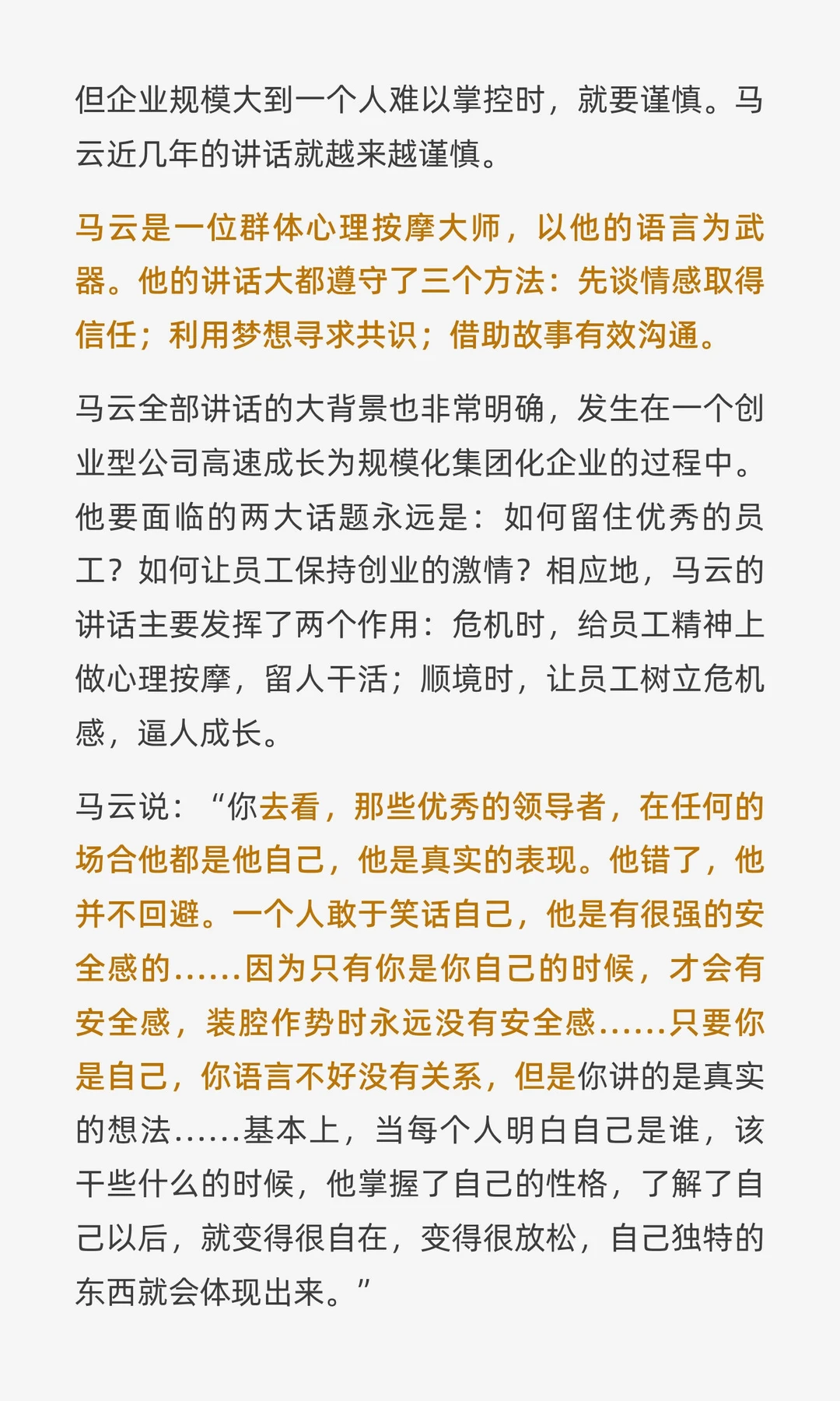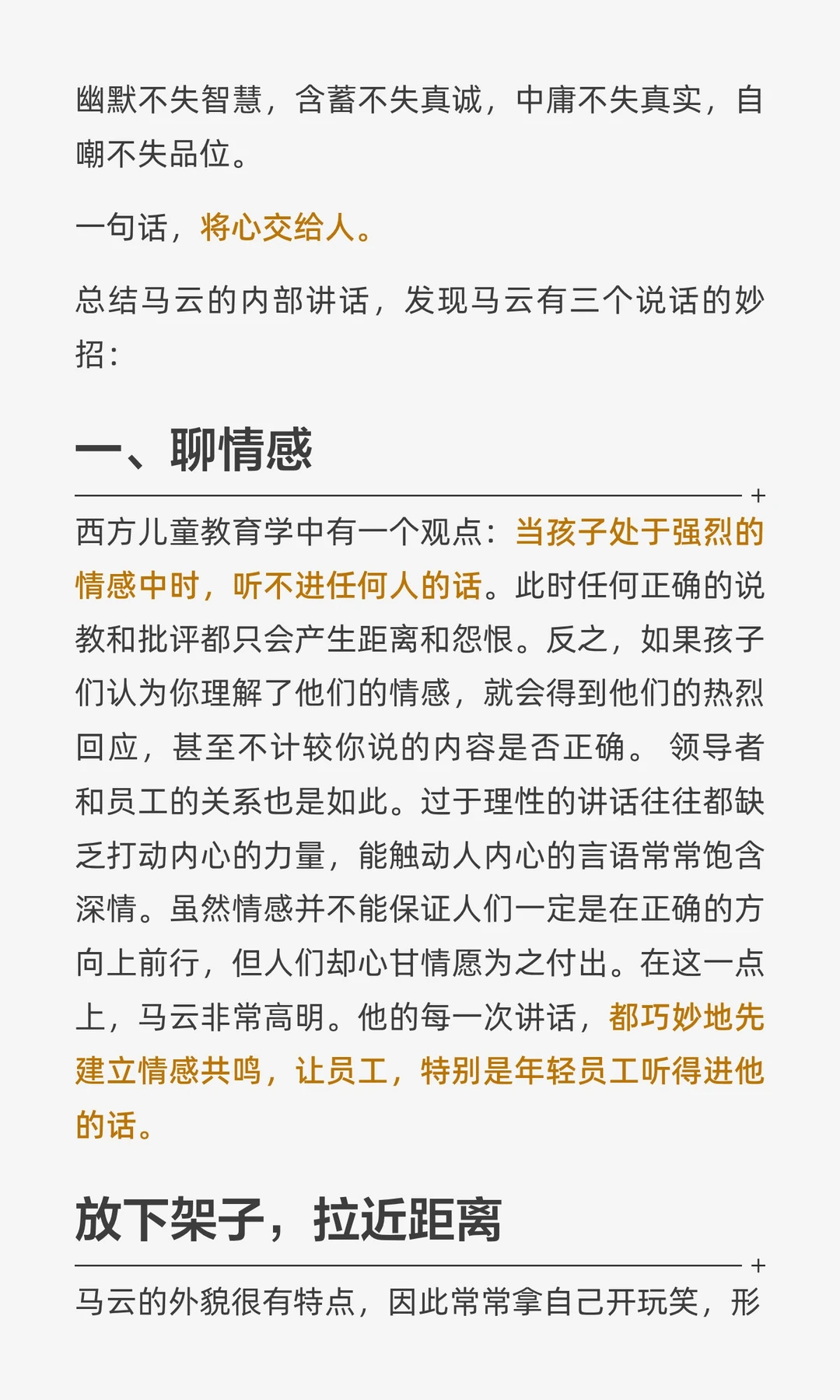马云的内部讲话以情感共鸣、梦想激励和故事讲述为核心,通过幽默与真诚建立信任,激发团队激情。 他巧妙运用“光环语言”和“光环词汇”,打造共同梦想,强调价值观与使命感,成为创业型企业的精神支柱。 一句话,将心交给人。
