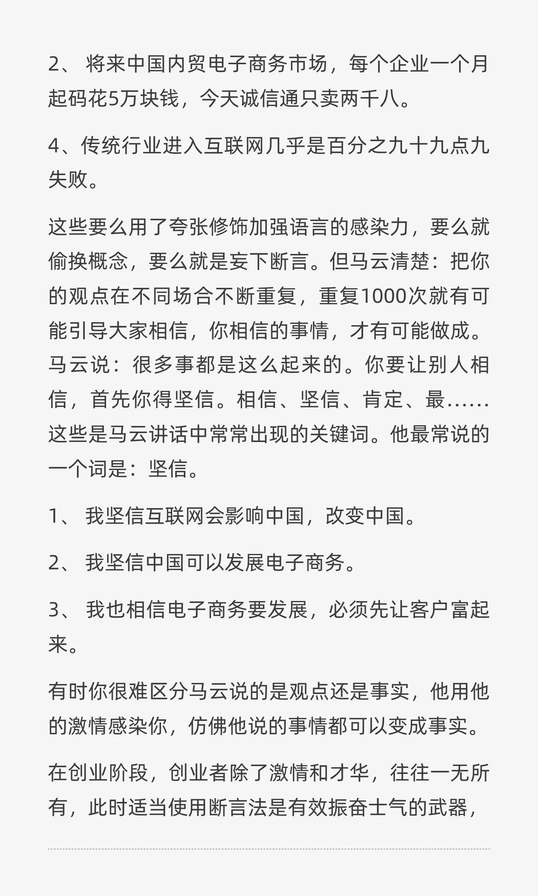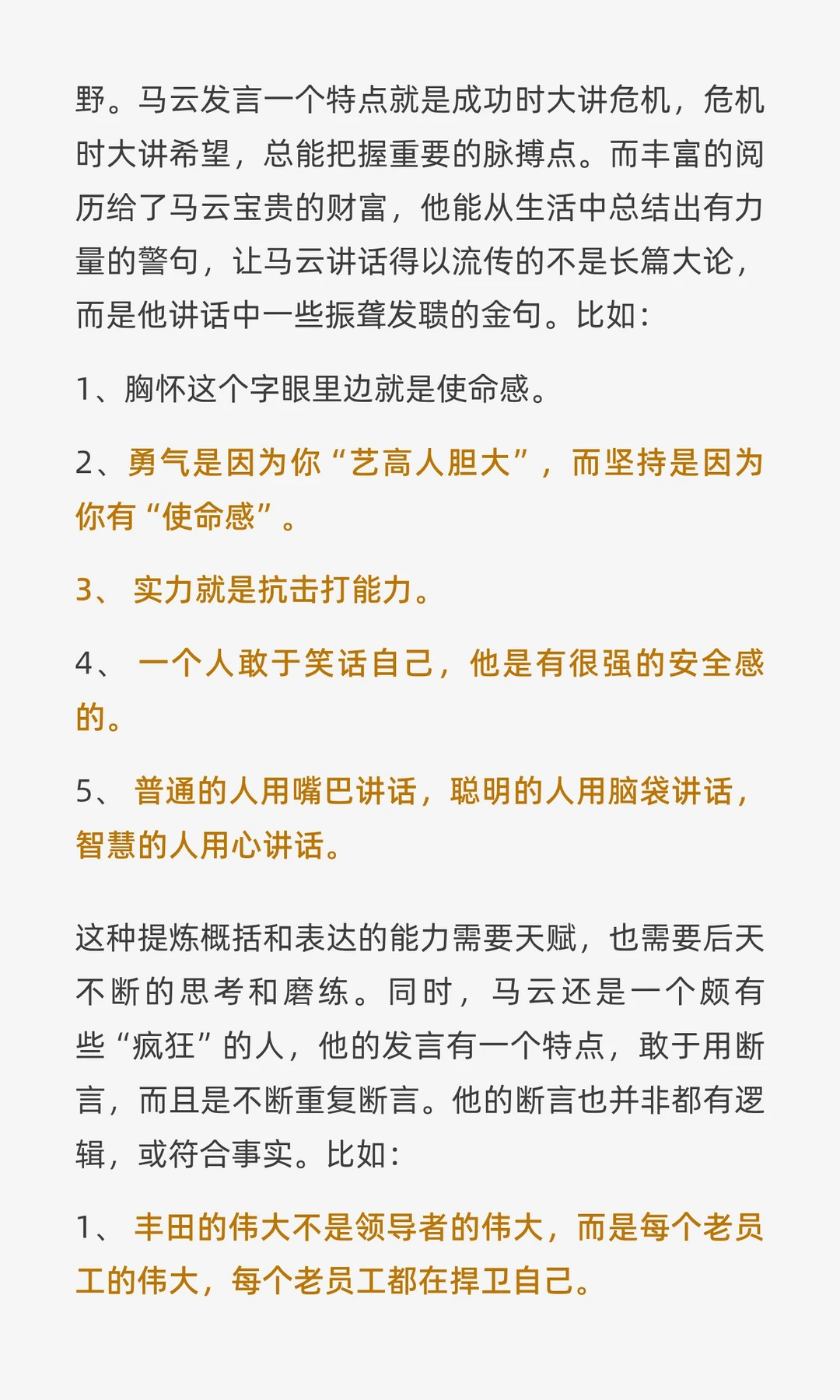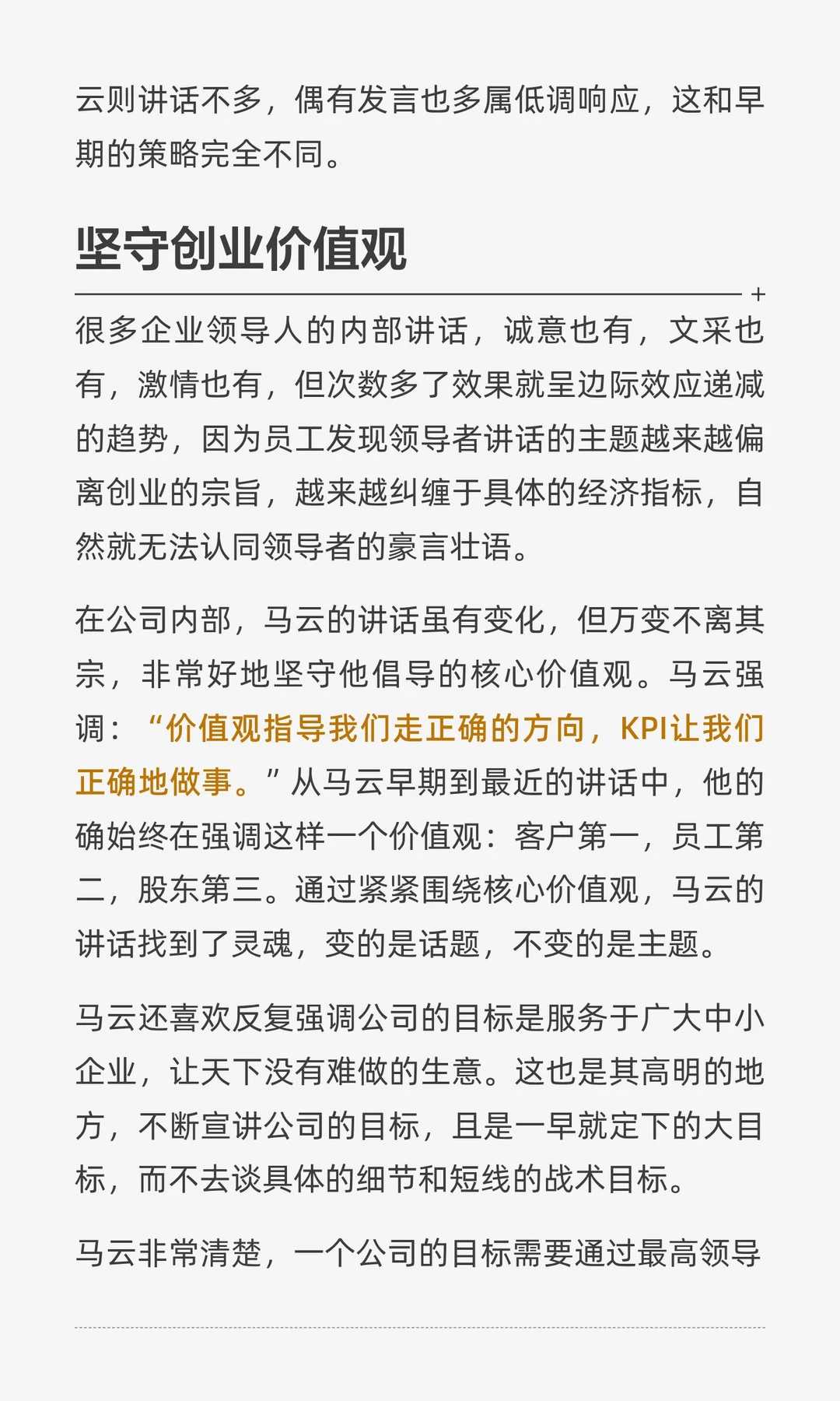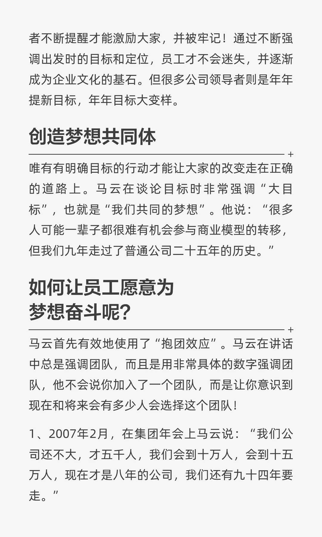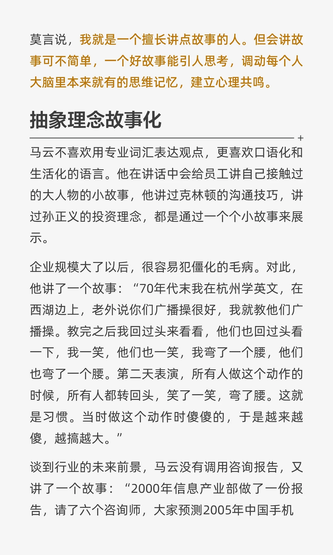 马云的内部讲话以情感共鸣、梦想激励和故事讲述为核心,通过幽默与真诚建立信任,激发团队激情。 他巧妙运用“光环语言”和“光环词汇”,打造共同梦想,强调价值观与使命感,成为创业型企业的精神支柱。 一句话,将心交给人。