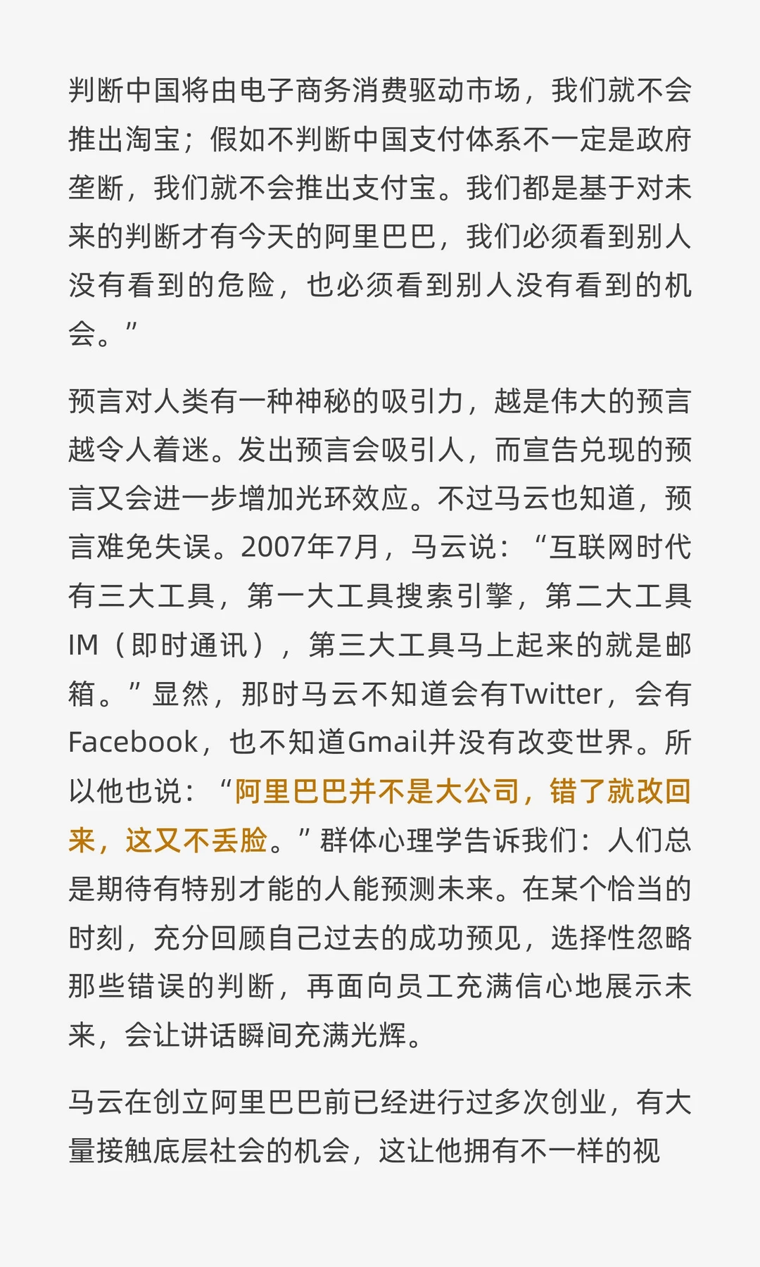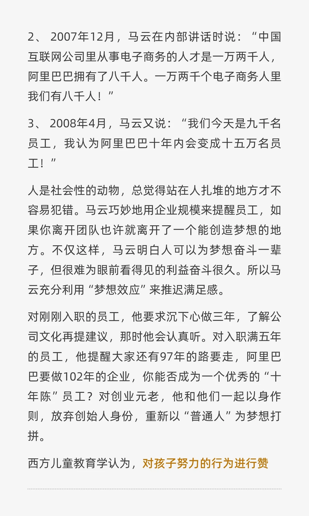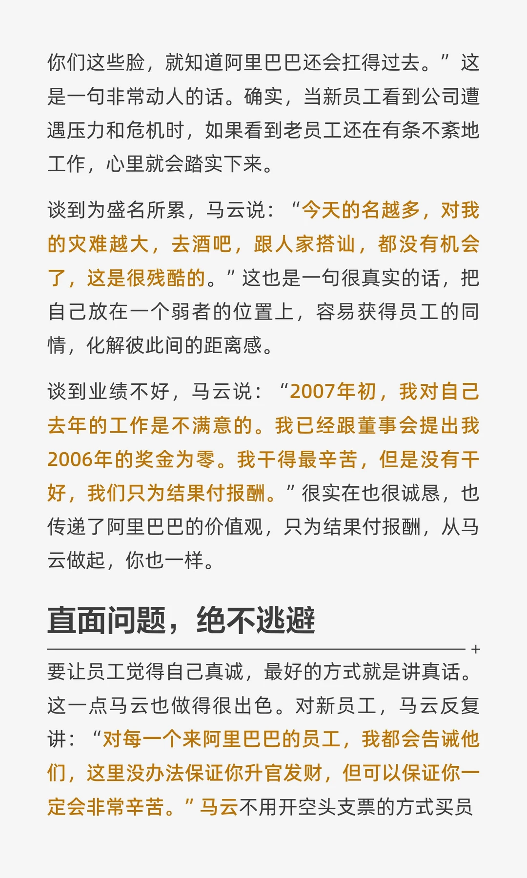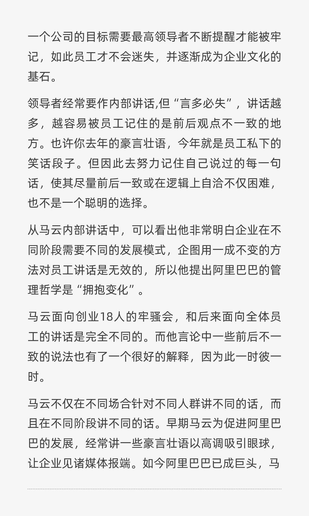 马云的内部讲话以情感共鸣、梦想激励和故事讲述为核心,通过幽默与真诚建立信任,激发团队激情。 他巧妙运用“光环语言”和“光环词汇”,打造共同梦想,强调价值观与使命感,成为创业型企业的精神支柱。 一句话,将心交给人。