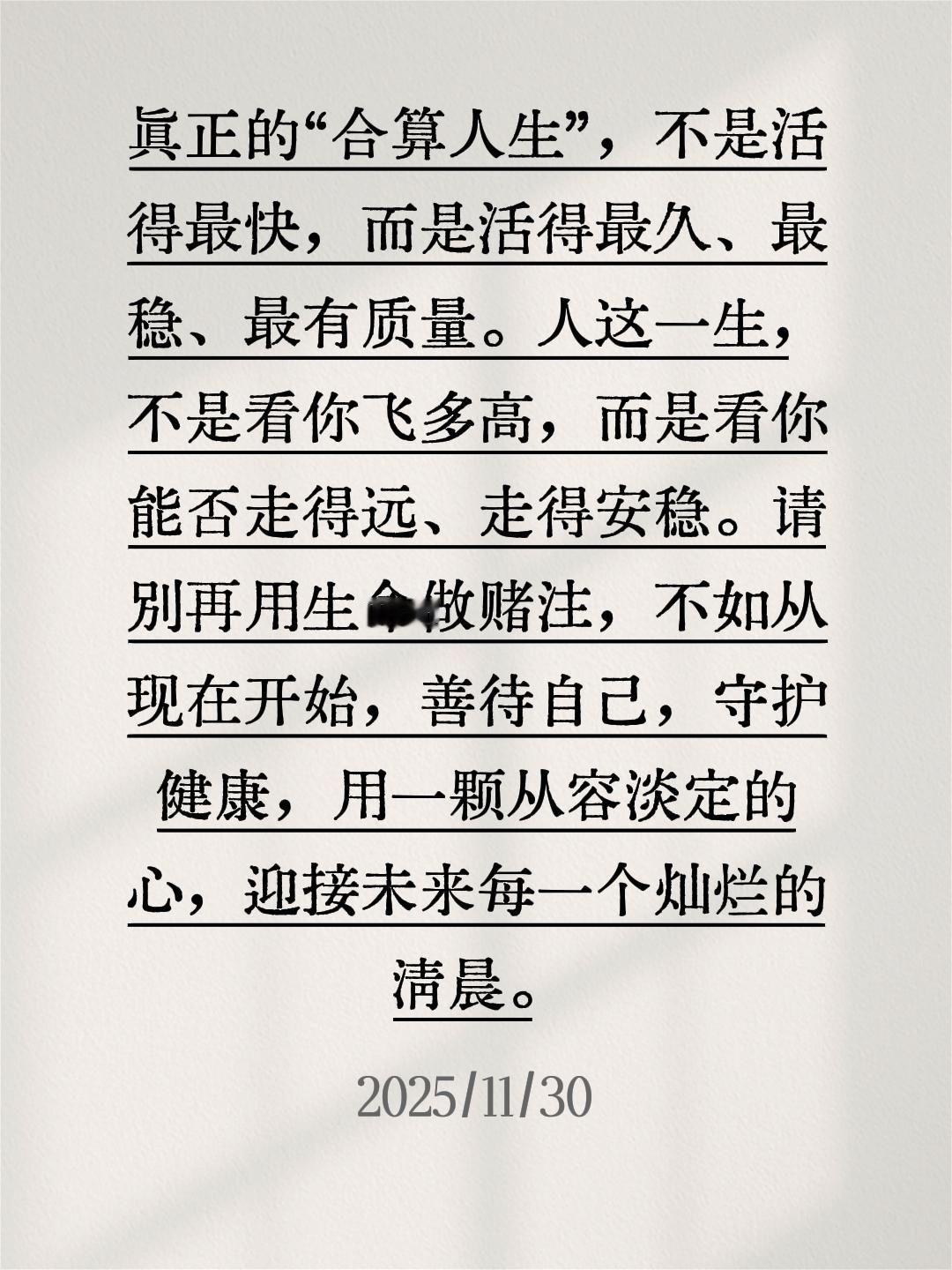 真正的“合算人生”,不是活得最快,而是活得最久、最稳、最有质量。人这一生,不是看你飞多高,而是看你能否走得远、走得安稳。请别再用生命做赌注,不如从现在开始,善待自己,守护健康,用一颗从容淡定的心,迎接未来每一个灿烂的清晨。