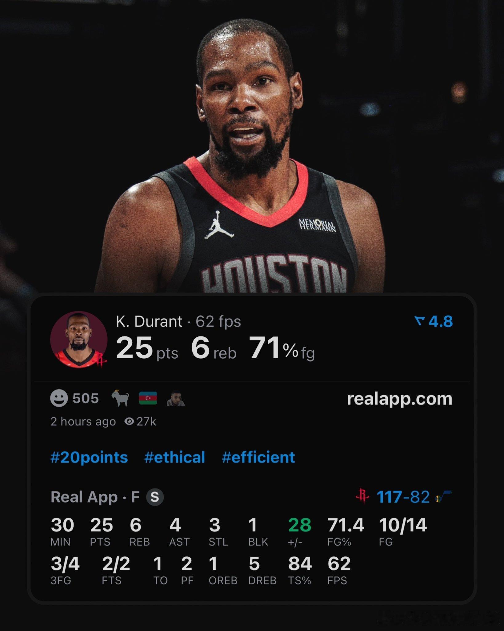 今天的杜兰特!出战29分钟25分6篮板4助攻3抢断1盖帽投篮14中10,三分4中3正负值+28如何评价KD今天的表现?火箭vs爵士