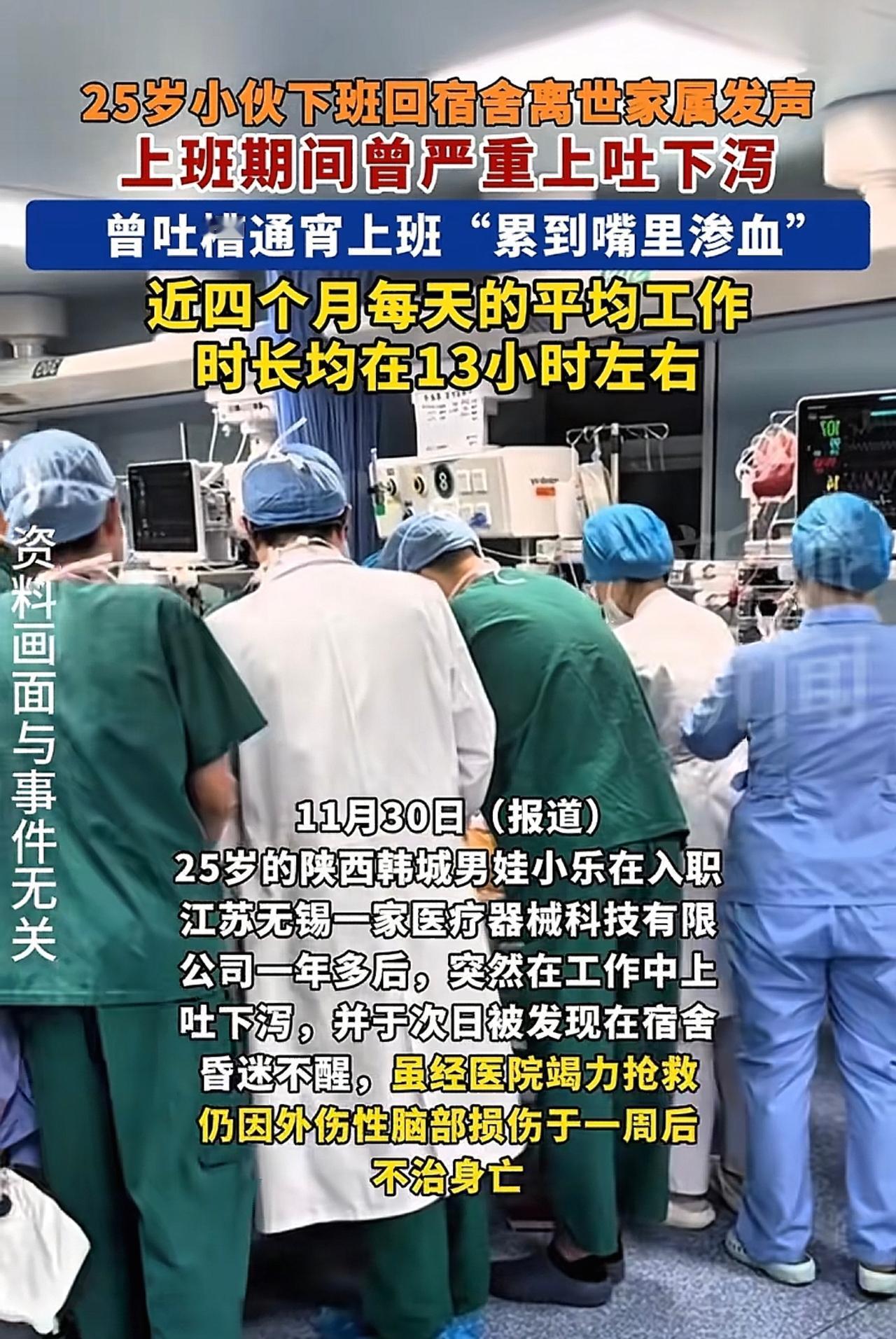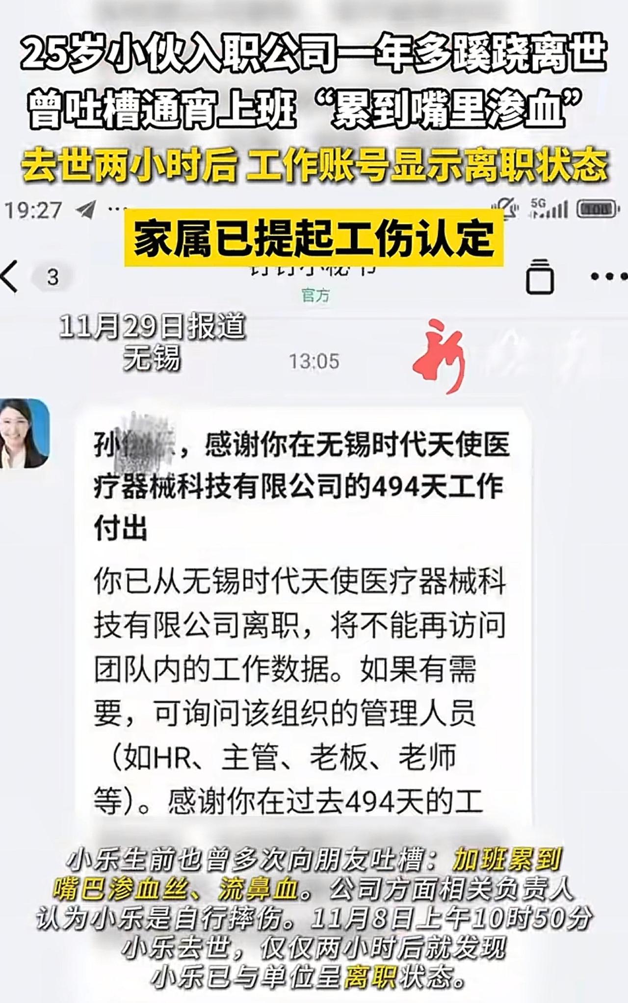 25岁小伙过度加班,嘴巴渗血丝、流鼻血,导致身体达到极限不幸离世,这就是打工人的悲哀。 每天加班平均13个小时,最多14.8个小时,请问国家的劳动法在哪里,这种单位视而不见,公然违背国家法律是不是该严惩。 而最让人哭笑不得,刚离世2小时,公司就立马变成离职员工,没有任何歉意,难道这么付出没有一点感恩之心吗。青年猝死 下班后猝死 工位猝死
