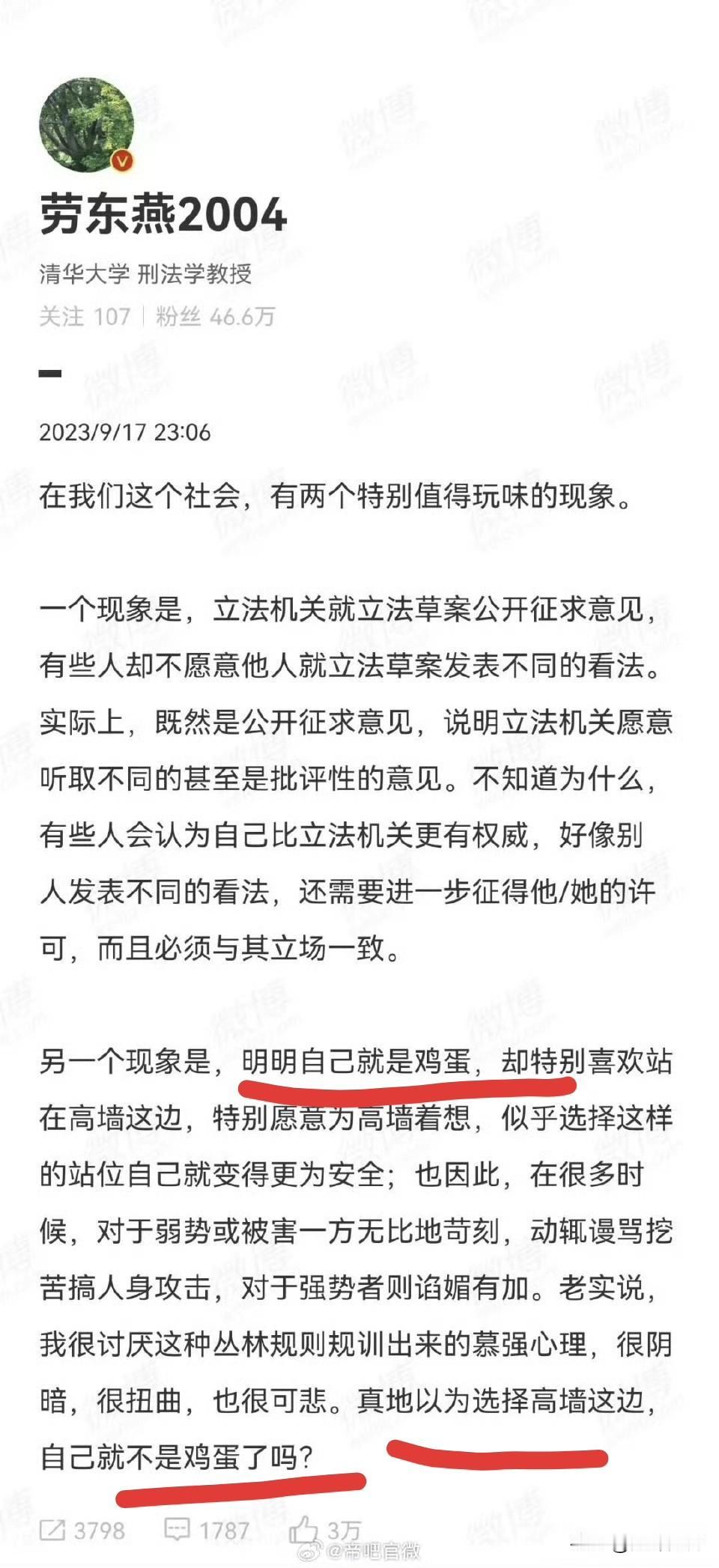 劳东燕之流,当高层的决策符合自己的意愿时,他们就用高层压制、威吓普通群众;当决策不符合自己的意愿时,就把与高层站在一起的普通群众污称为“鸡蛋”,把高层污称为“高墙!” 当劳东燕之流发表意见的时候,叫“不同意见”;当普通群众发表“意见”时,就被污蔑为“大规模围攻”与“人身攻击”! 当劳东燕之流利用高层压制、恐吓群众时,那就是“法律界共识”;当普通群众和高层站在一起时,就是“对于强势者谄媚有加”!