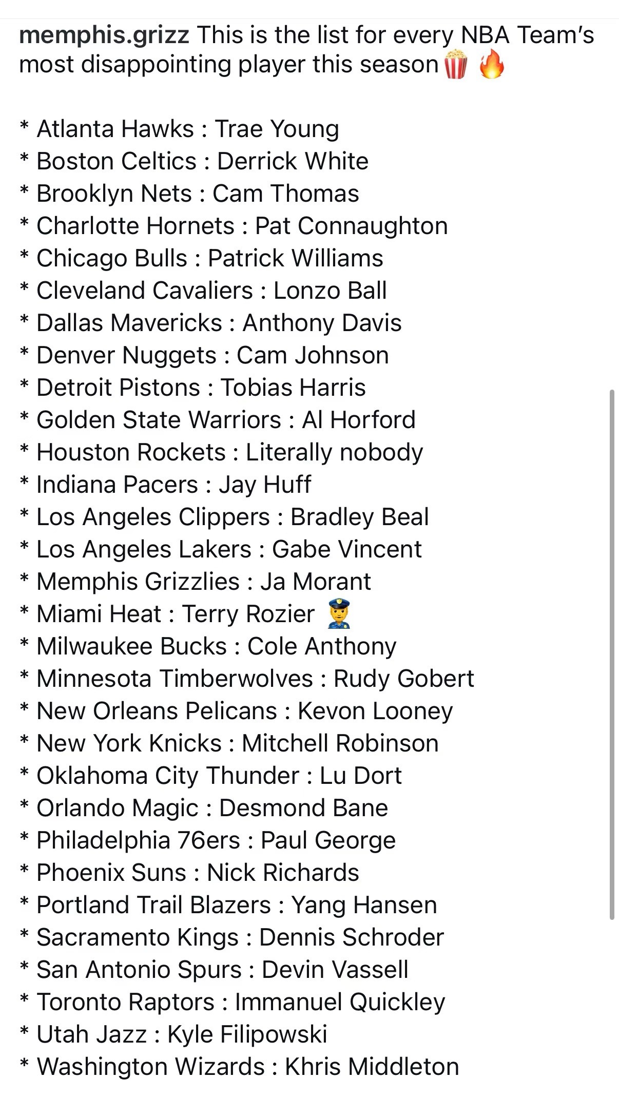 给你们说个好玩的,外网灰熊的自媒体发了一个帖子: 评选本赛季各个球队最让人失望的球员。杨瀚森上榜了…和他一起上榜的还有特雷杨,浓眉,莫兰特。对一个新秀期待这么高我也是谢谢他