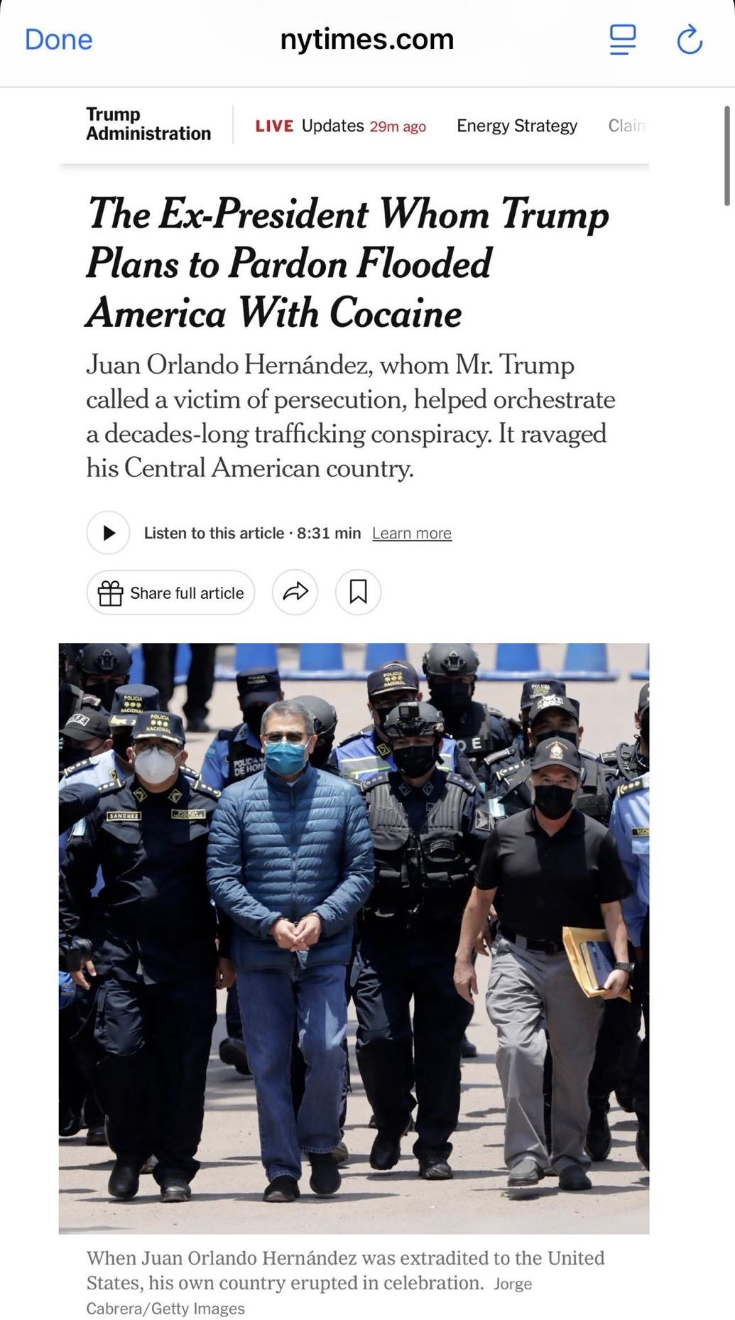 记者问:你能解释一下你为什么会赦免一个臭名昭著的毒贩吗? 特朗普:我不知道你在说谁。 记者:胡安·奥兰多·埃尔南德斯(洪都拉斯前总统) 特朗普:洪都拉斯很多民众都说这是拜登的阴谋。 胡安·奥兰多·埃尔南德斯多年来组织向美国贩运500吨可卡因的大毒枭,下台后被引渡美国受审,被拜登政府判处无期徒刑。