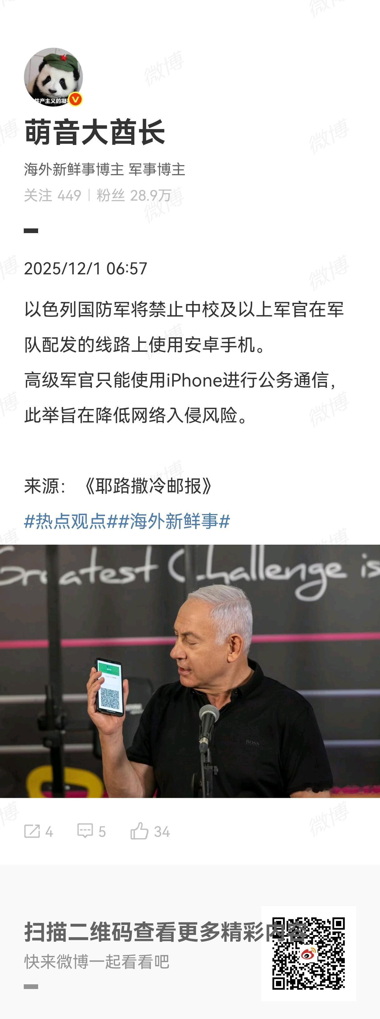 据耶路撒冷邮报报道:以色列国防军将禁止中校及以上军官在军队配发的线路上使用安卓手机。以色列高级军官只能使用iPhone进行公务通信。以色列军方给出的解释是为了降低网络入侵风险。看这条新闻,首先觉得很好笑,数字时代谈绝对的网络安全,相当于秃子头上的虱子。我们是不是可以这样理解,犹太集团目前还没有全面控制除苹果以外的其他手机操作系统,但全面控制了苹果操作系统。没有控制表示可能会泄密,被窃听;控制住了,那肯定能够指哪打哪、为我所用。