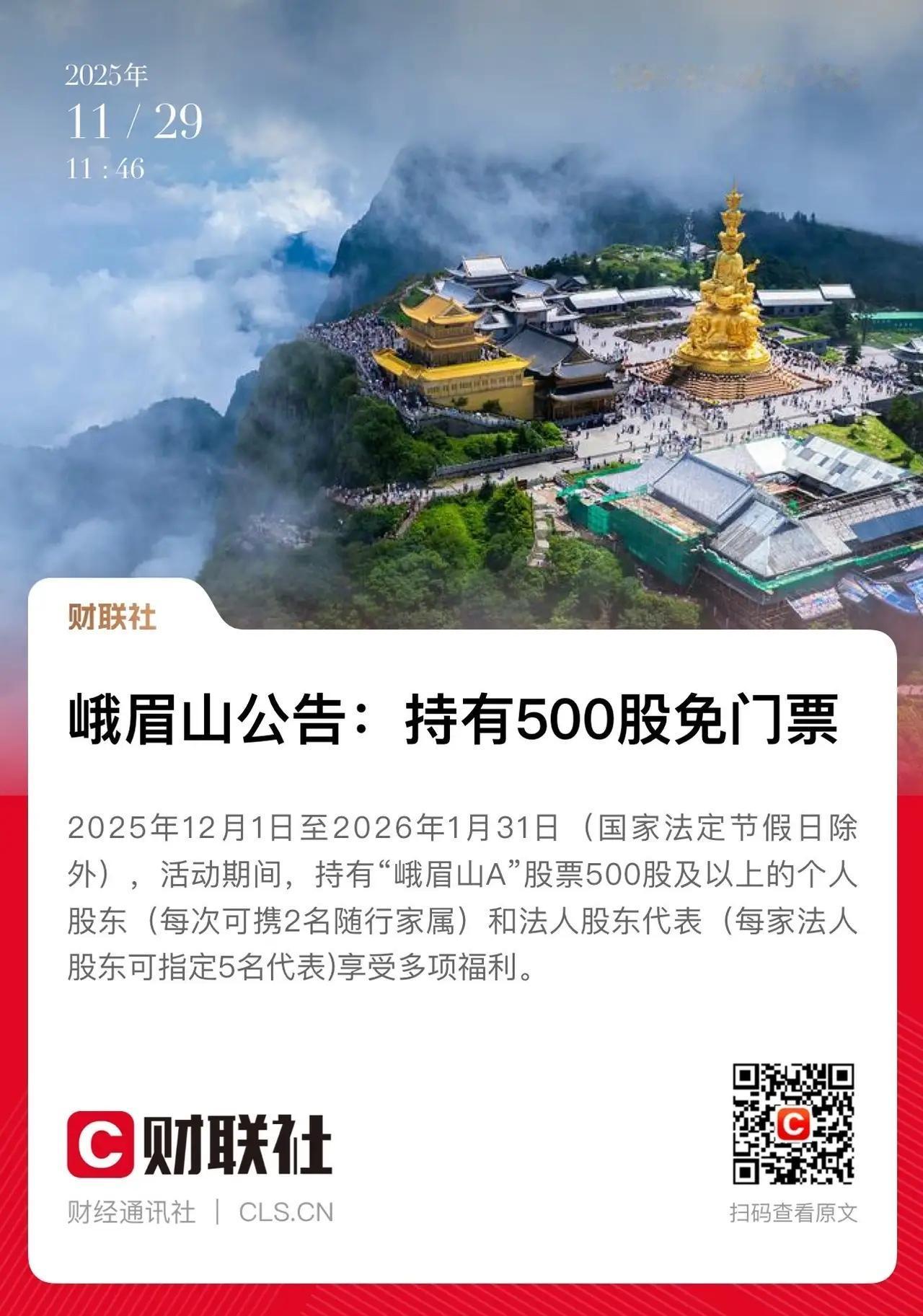 建议全国的消费景点效仿! 峨眉山出了公告,只要持股500以上即可免费游玩,这样肯定可以带起消费,建议所有的消费行业都这样,只要持有公司股票都可以享受优惠的让股东权益得到享用!