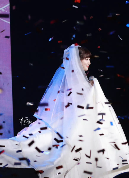 李艺彤以融合仙气与舞台张力的拖尾婚纱登场,头纱轻垂、裙摆铺展如盛绽的月光花。她以此造型演绎《夏之回忆》与《木偶》两首治愈系单曲,歌声与视觉交织成强烈的情感冲击。
