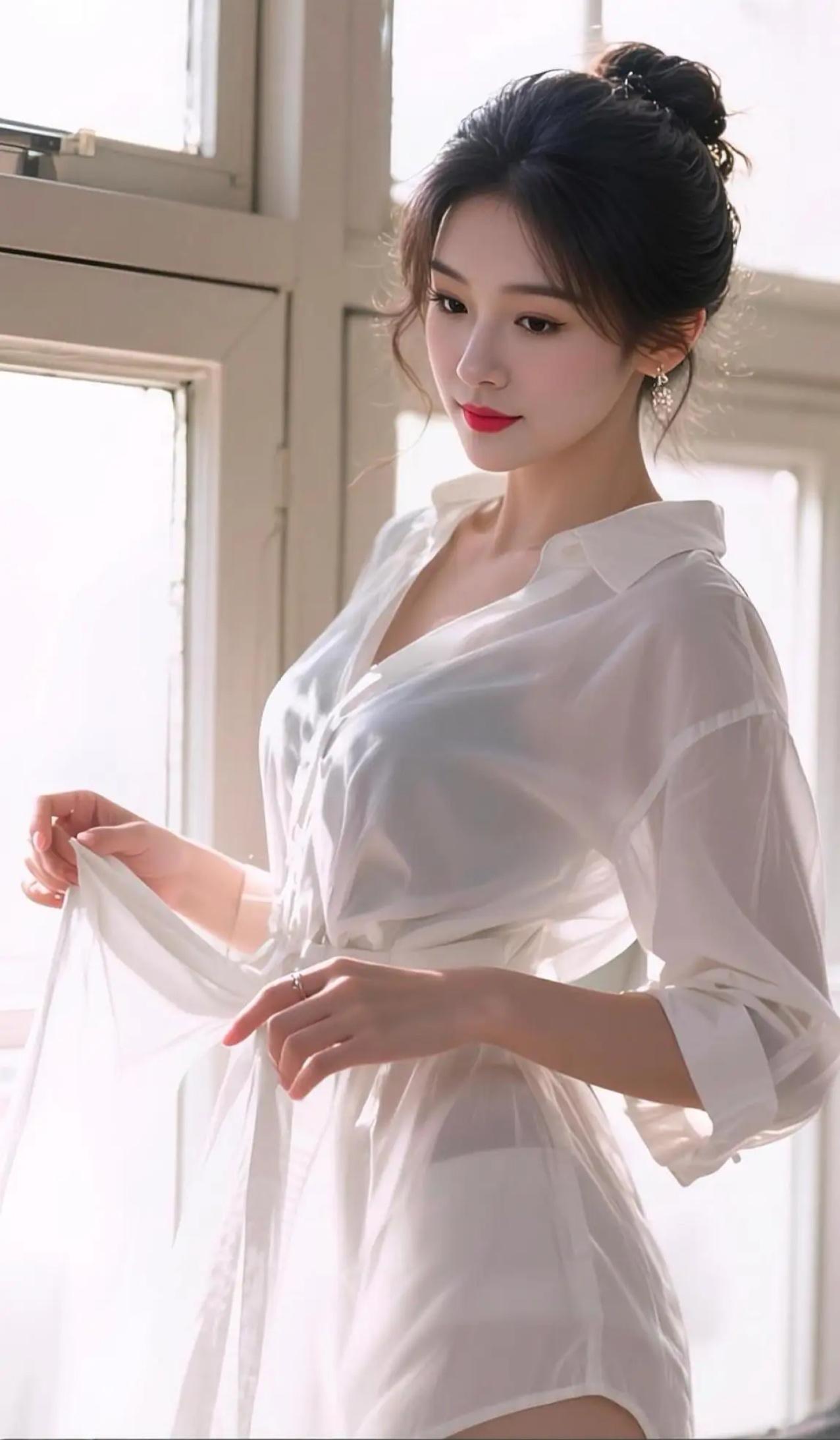 《光影中的温柔瞬间》 阳光穿过百叶窗的缝隙,在米白色墙面投下琴键般的光影。她站在光瀑中央,乌黑发髻边缘的碎发被镀上金边,像宣纸上晕开的墨痕。白衬衫领口微敞,露出锁骨处细腻的弧度,第三颗纽扣在晨光里泛着珍珠母贝的光泽。当风掀起纱帘,她无名指上的铂金戒指忽然苏醒,戒圈内镌刻的日期在光斑中若隐若现——那是去年深秋,银杏叶飘落教堂台阶的时节。 "要帮我看看领口是否整齐吗?"她转身时,耳垂上的钻石耳钉在颈侧投下星芒。这个角度让窗外的梧桐树影恰好掠过她的眉骨,仿佛给精致的眼妆添了道天然眼线。左手腕间的银色手链微微晃动,链坠是朵永不凋谢的玫瑰,与衬衫第二颗纽扣旁的手工刺绣形成隐秘对话。忽然想起昨夜读过的诗句:"锁骨间栖息的蝴蝶,是时光忘记带走的标本。" 当云层遮住太阳的刹那,墙面光影开始流动。她抬手整理鬓发时,戒指在无名指上转过十五度,这个角度让铂金戒圈与窗框的金属包边完成一次光的接力。背景里模糊的绿植突然清晰起来,龟背竹的叶脉间渗出细碎光点,像她眼底流转的温柔。此刻整个空间变成显影液里的相纸,正在定格某个重要时刻前的静谧。 远处传来教堂钟声,她无名指不自觉地轻颤。戒指内侧的刻痕突然变得滚烫,那是去年今日他握着刻刀时,落在戒圈里的体温。当第十一声钟响消散在空气里,她忽然对着虚空微笑——玻璃窗映出的身影中,多了一双正在为她系项链的手。风掀起纱帘的瞬间,那枚铂金戒指在光影中完成蜕变,化作衔着橄榄枝的白鸽,向着透光的云端翩然飞去。