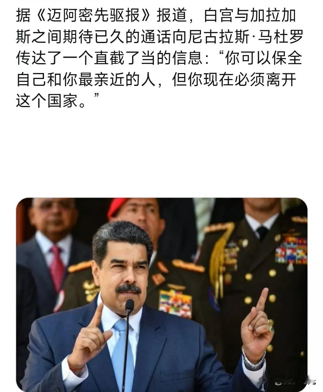 特朗普表示,他对委内瑞拉领空的警告不应被解读为即将发动空袭。 他还证实自己与马杜罗通了电话,但只说“我不会说通话进行得好还是不好,只是通了个电话而已。 ” 记者:您能告诉我们为什么委内瑞拉上空的空域应该被视为关闭吗? 特朗普:因为我们认为委内瑞拉不是一个非常友好的国家。 记者:您的警告是否意味着空袭即将发生? 还是我们不应该这样理解? 特朗普:别想太多。 据《迈阿密先驱报》报道,白宫与加拉加斯之间期待已久的通话向尼古拉斯·马杜罗传达了一个直截了当的信息:“你可以保全自己和你最亲近的人,但你现在必须离开这个国家。”