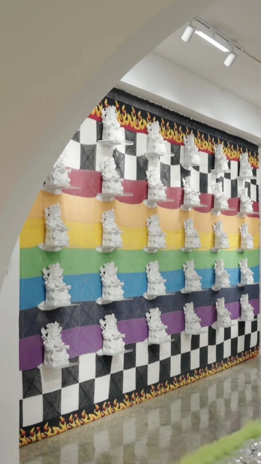 我的工作室里,还有很多钩织的艺术装置。朋克财神墙,很有广东特色。刚开工作室的时候,阿姨问我有没有接财神,我就去接了30尊。背景是彩虹的颜色和一些火的元素,都是一针一线钩出来的。