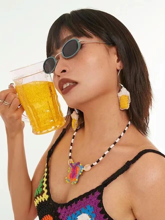 《啤酒》系列,是我断片第二天钩出来的,真的喝得太多了,太痛苦了。有一个笑脸,代表微醺的状态。我会戴着它们去喝酒,时不时警示一下自己,不要喝太多。