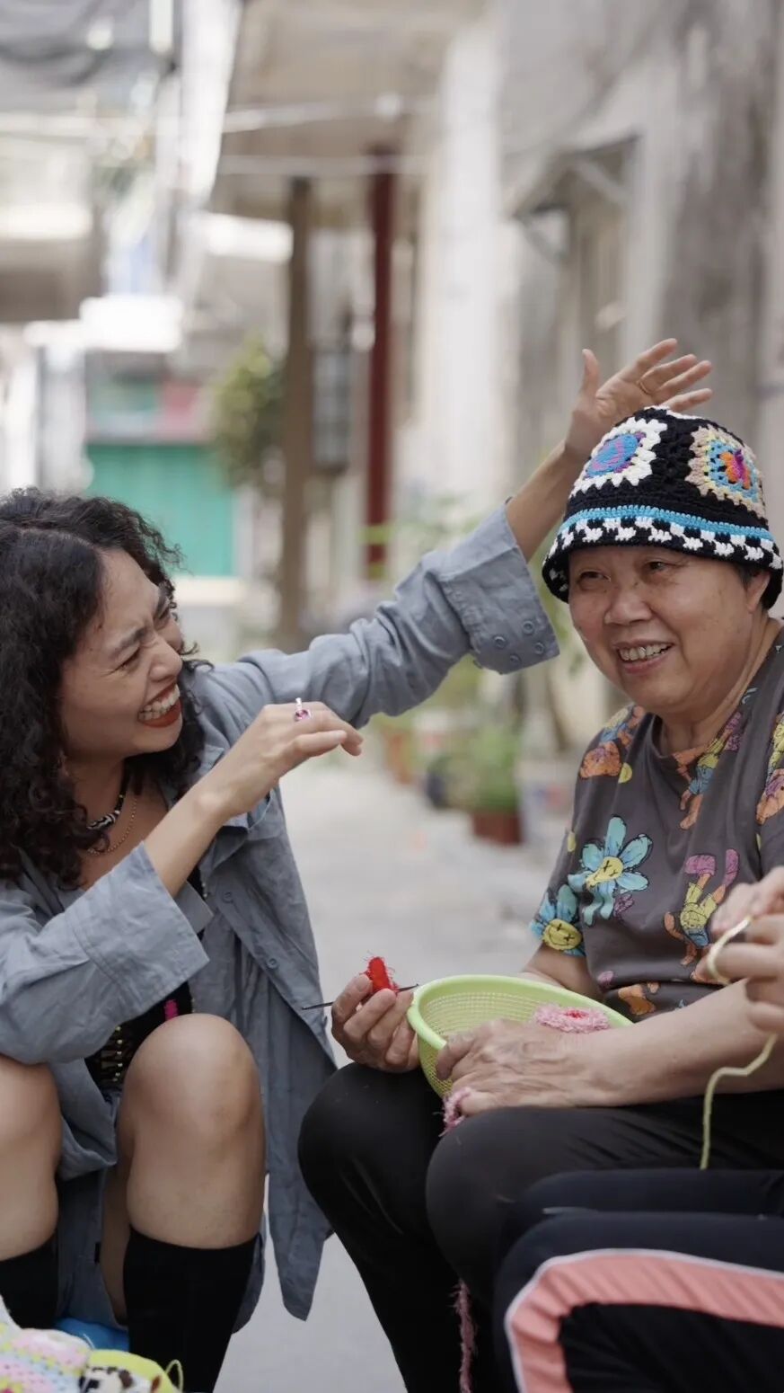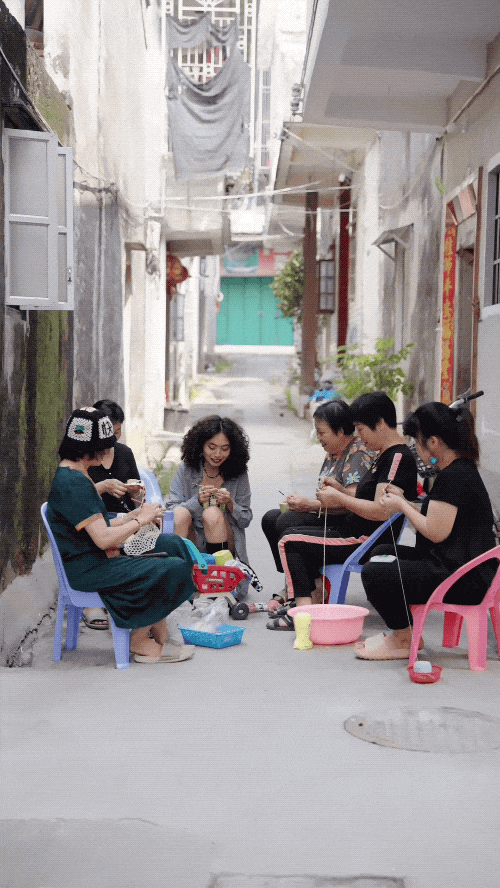 我家工厂的员工,基本都是村里的阿姨,她们都是看着我长大的。我去问她们,愿不愿意相信我。对于这些阿姨来说,钩织已经成为了她们熟悉的生活方式。拿个线,到处串门,几个小姐妹待在一起,唱潮剧,聊天,非常放松。所以她们也都愿意和我接着做下去。