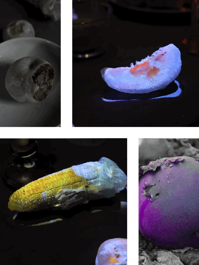 这个“封存遗体”的概念,最早的灵感来源于我在日本富山,面对当地成片的梨树,春夏秋冬观察梨树从发芽、结果,到被自然或人为淘汰、掉落果实的过程。我就想为它们办一场葬礼——捡了很多地上掉落的梨子翻模,把梨灰烧在玻璃罐里。