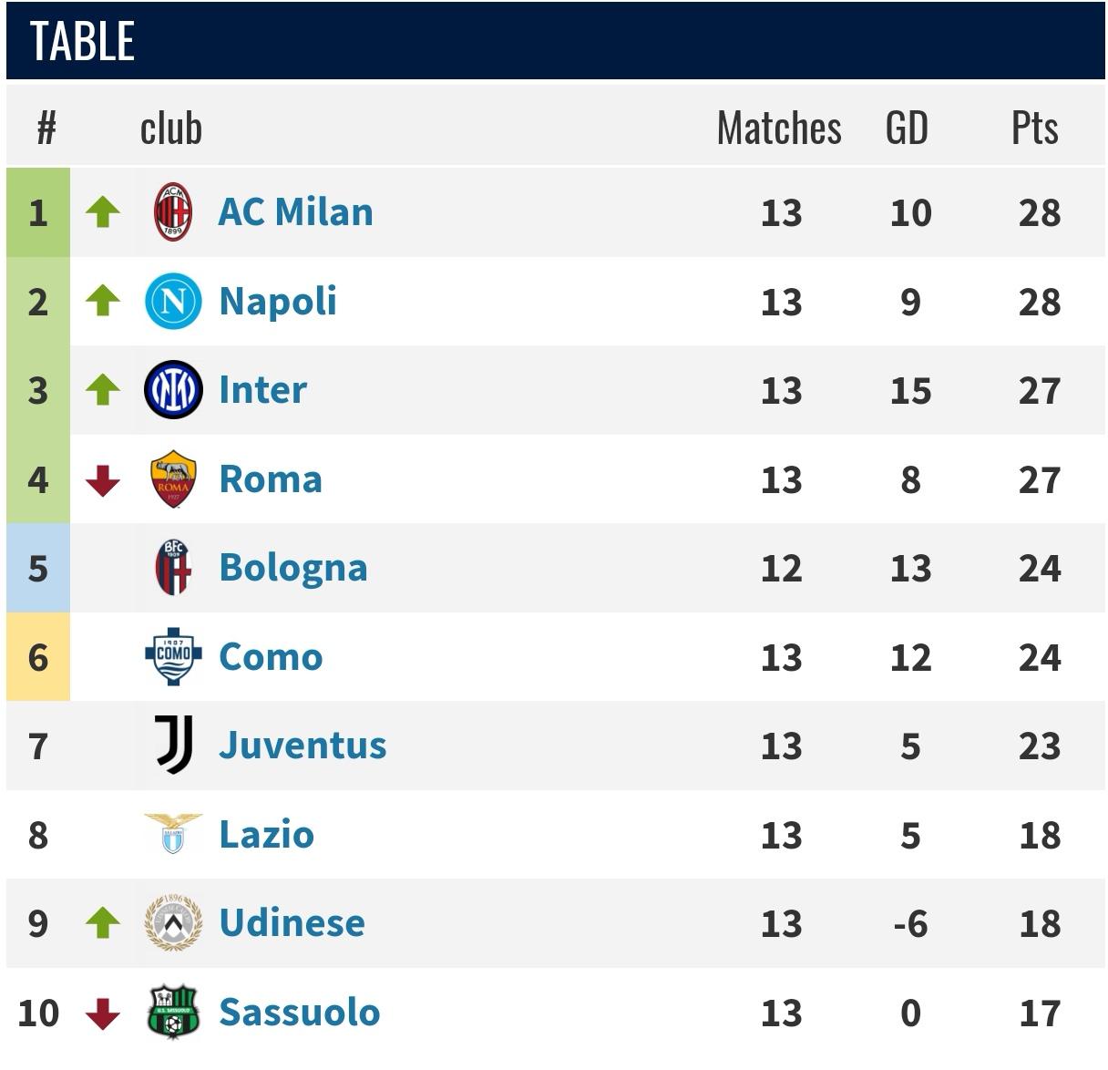 随着意甲最新一轮的结束,最新积分榜出炉,AC米兰、那不勒斯、国米和罗马位列前四,不出意外今年的意甲冠军将在这四支球队中产生!博洛尼亚少赛一场排名第五,科莫和尤文图斯分列第六、第七! 本轮的焦点战是罗马主场对阵那不勒斯,那不勒斯再次展现了自己“外战外行,内战内行!”的特点!凭借内维斯的进球,那不勒斯1-0小胜罗马,将罗马从积分榜第一的位置拉了下来,他们则上升到了第二名! 国际米兰虽然赛季初遭遇了困难,几场强强对话也都输球了,但他们凭借着对中下游球队的稳定战绩,已经赶了上来!小图拉姆复出后,劳塔罗也找回了进球的感觉,本轮梅开二度,帮助球队2-0战胜比萨,国米也上升到了积分榜第三的位置,和第一名米兰也只有1分的差距! 本赛季没有欧战任务的米兰赛程相对比较轻松,他们也很争气,在与几支争冠对手的直接对话中全部取得了胜利,唯一问题就是面对中下游球队的平局有些多!本轮凭借莱奥的进球,他们1-0小胜拉齐奥,凭借净胜球优势登上了榜首位置! 博洛尼亚和科莫虽然最近两个赛季表现不俗,但阵容厚度跟前面四支队伍比还是有差距,或许会对争冠造成一些干扰,但他们应该不具备争冠的能力!