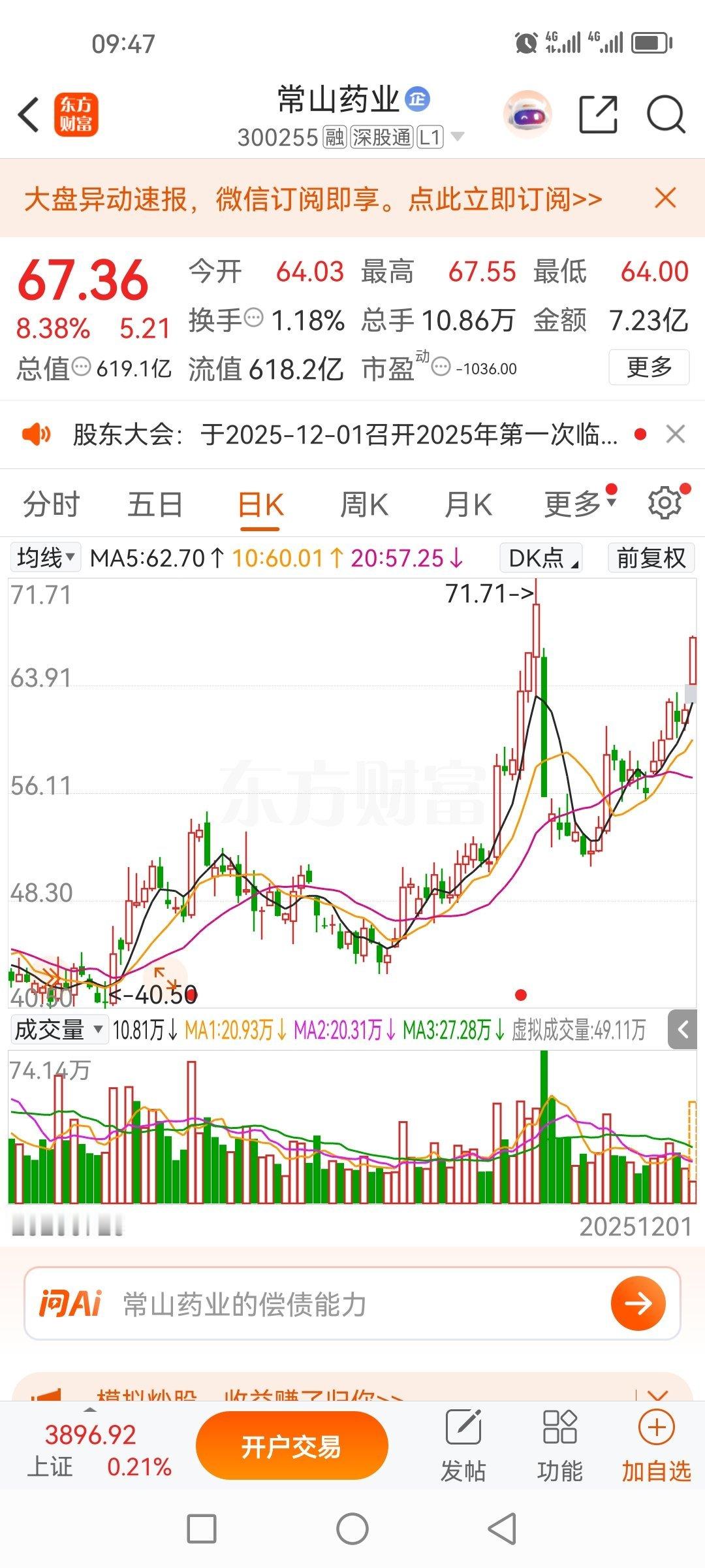 17日盘前分享的常山药业300255,连续涨,连续高开,目前到今天为止,还是一样蹭蹭往上走,妥妥的吃肉大票!