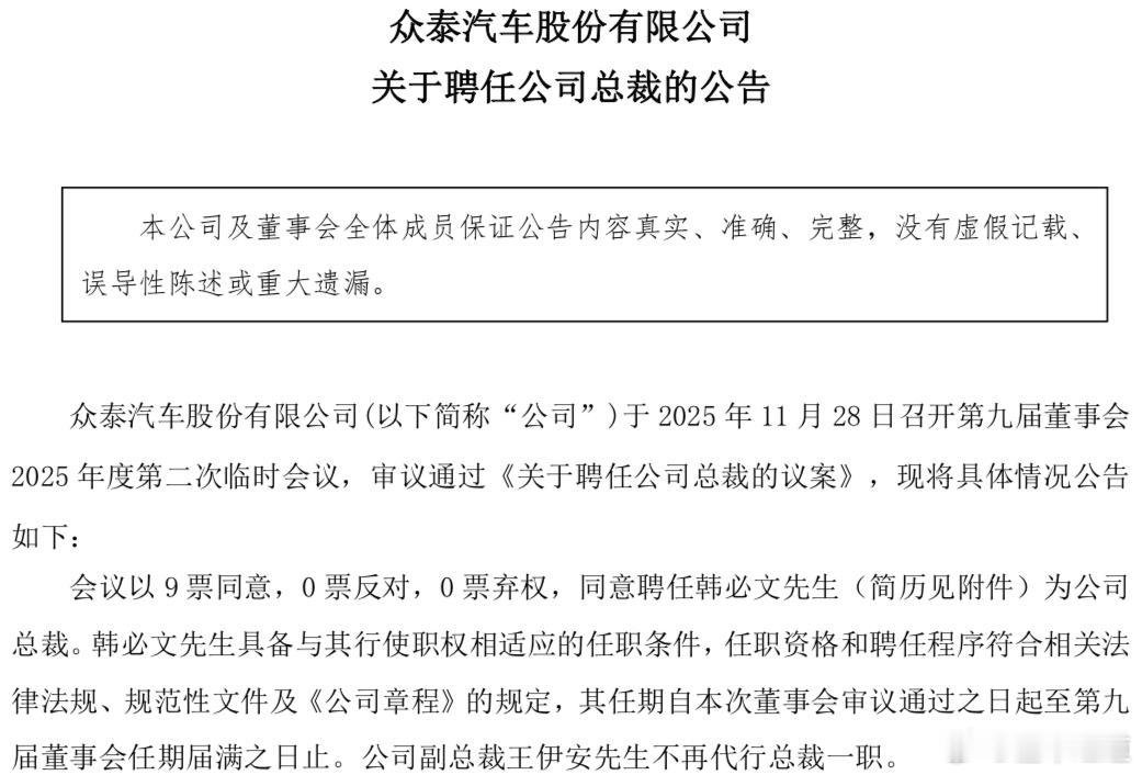 懂车之道讯 懂车之道快讯,众泰汽车总裁职位终于确定人选了。11月28日,众泰汽车股份有限公司发布关于聘任公司总裁的公告。公告内容显示,众泰汽车召开第九届董事会2025年度第二次临时会议,会议同意聘任韩必文为众泰汽车总裁。任期自本次董事会审议通过之日起至第九届董事会任期届满之日止。公司副总裁王伊安先生不再代行总裁一职。公开资料显示,韩必文于1978年4月出生,毕业于安徽大学,本科学历,现任众泰汽车总裁。自2001年开始加入奇瑞汽车,先后在乘用车二厂担任高级技工、车间主任、副厂长、制造中心总监等职务,2015年9月升任奇瑞捷豹路虎合资公司制造执行副总经理。2016年12月至2020年9月任观致汽车制造和质量副总裁、常熟基地总经理。2020年9月至2024年4月任奇瑞汽车制造事业部总经理。2024年4月至2025年10月任职开沃新能源汽车有限公司担任联席CEO兼国际营销中心总经理。