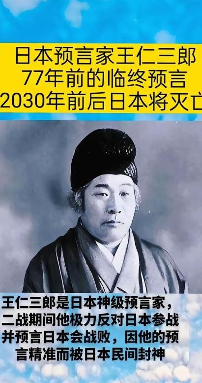 怪不得日本这么着急想跟咱们打一仗,原因很简单,日本著名预言家预言日本将在2030年灭绝,自从他预言日本会在二战战败后,这个预言家就出名了。 我们要知道,在二战爆发的时候,这个预言家王仁三郎就表示,日本将会战败,一开始日本人还没当回事,但结局证明了这个预言家的含金量。 说白了,这个预言家之所以能说日本会战败,大概率是看清了日本社会的状态,一个地理面积不大的小国,有什么实力能对抗那么多国家,可在日本人眼里,他说的这些话就是语言,并且传的神乎其神。 当这位预言家去世的时候,他的最后一个预言就是日本将在2030年灭绝,所以日本现在就要杜绝这件事的发生,日本能想到的解决方法大概率就是战争了,不过很显然,这条道路是走不通的。 如果日本非要走那条道路,那咱们不介意让那个时间提前。