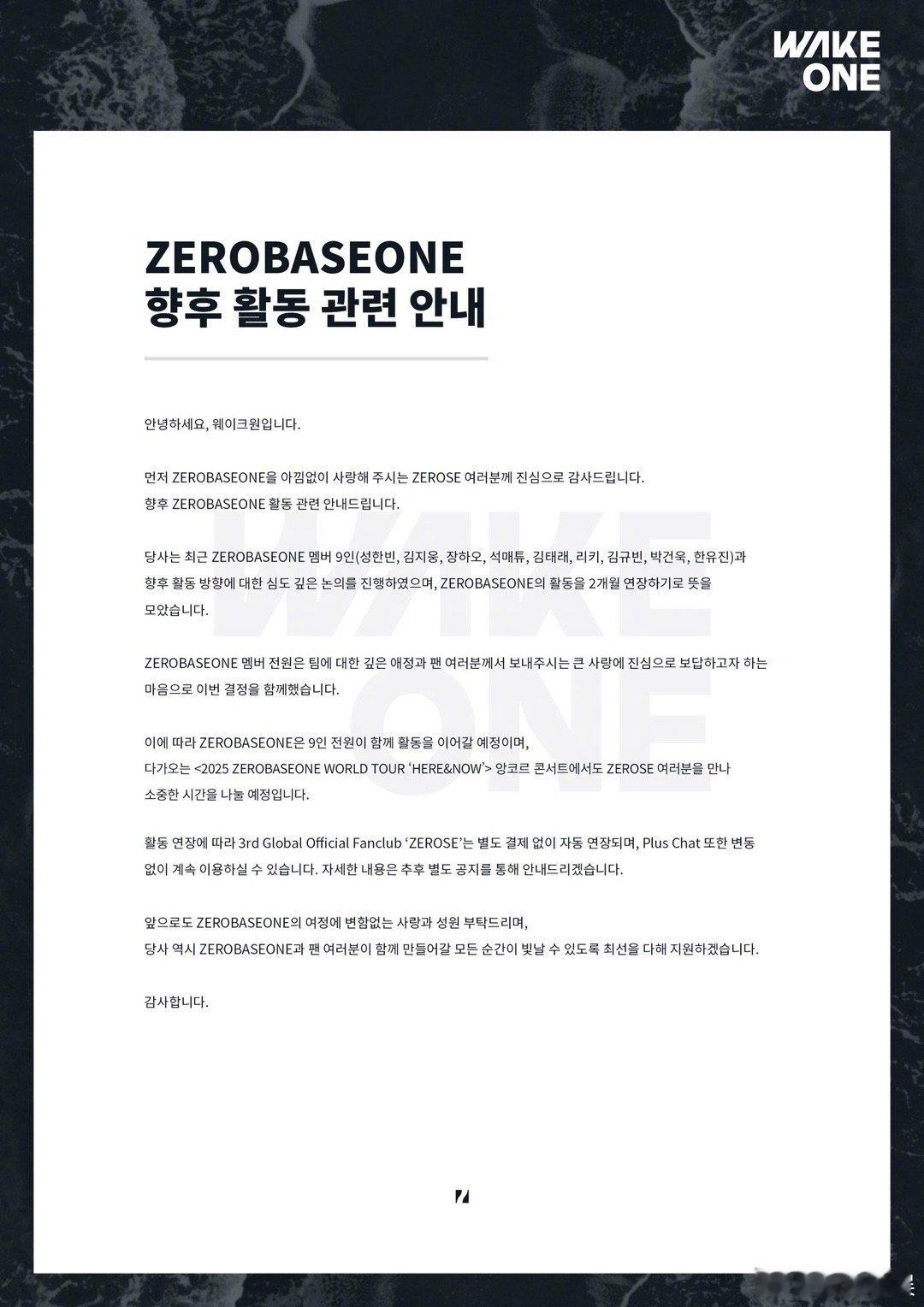 ZB1活动期延长2个月 WAKEONE发布公告:ZB1完整体活动延长2个月,“新作品正在准备中” 。ZB1在粉丝们的热烈支持与厚爱下,9名成员一致决定完整体活动延长2个月。此次决定是成员们出于对组合的深厚情感以及为回报ZEROSE不变的厚爱而共同作出的,他们计划以完整体继续活动至3月。为此,组合正在准备《2025 ZEROBASEONE WORLD TOUR “HERE&NOW”》安可场演唱会及新作品发行事宜。