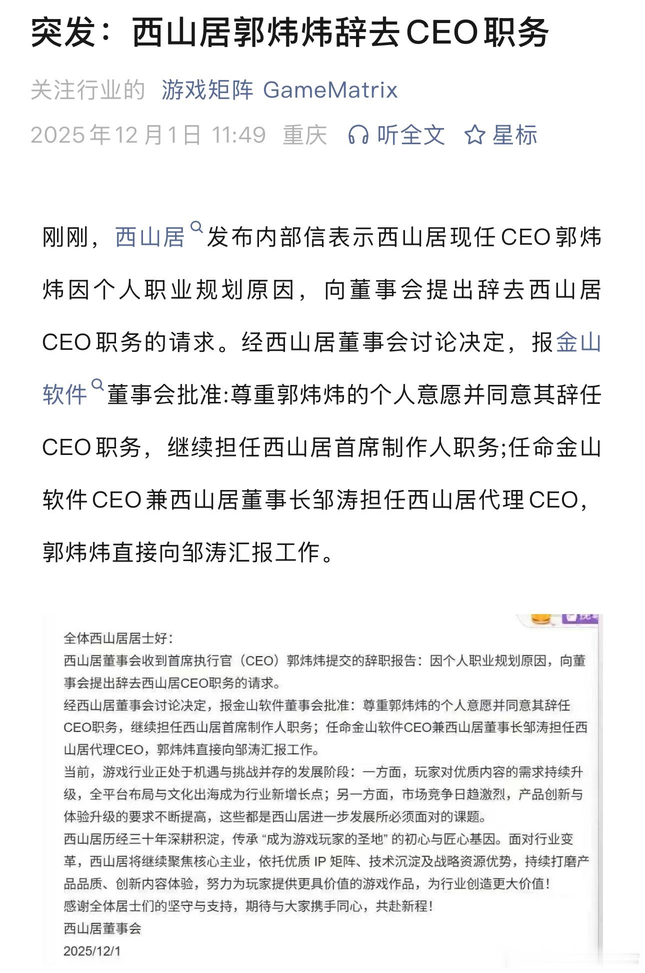 郭炜炜降职抓业务,游戏行业也难啊,感觉已经很久都没出过爆款了,之前不少被寄予厚望的大作出来之后都是雷声大雨点小~