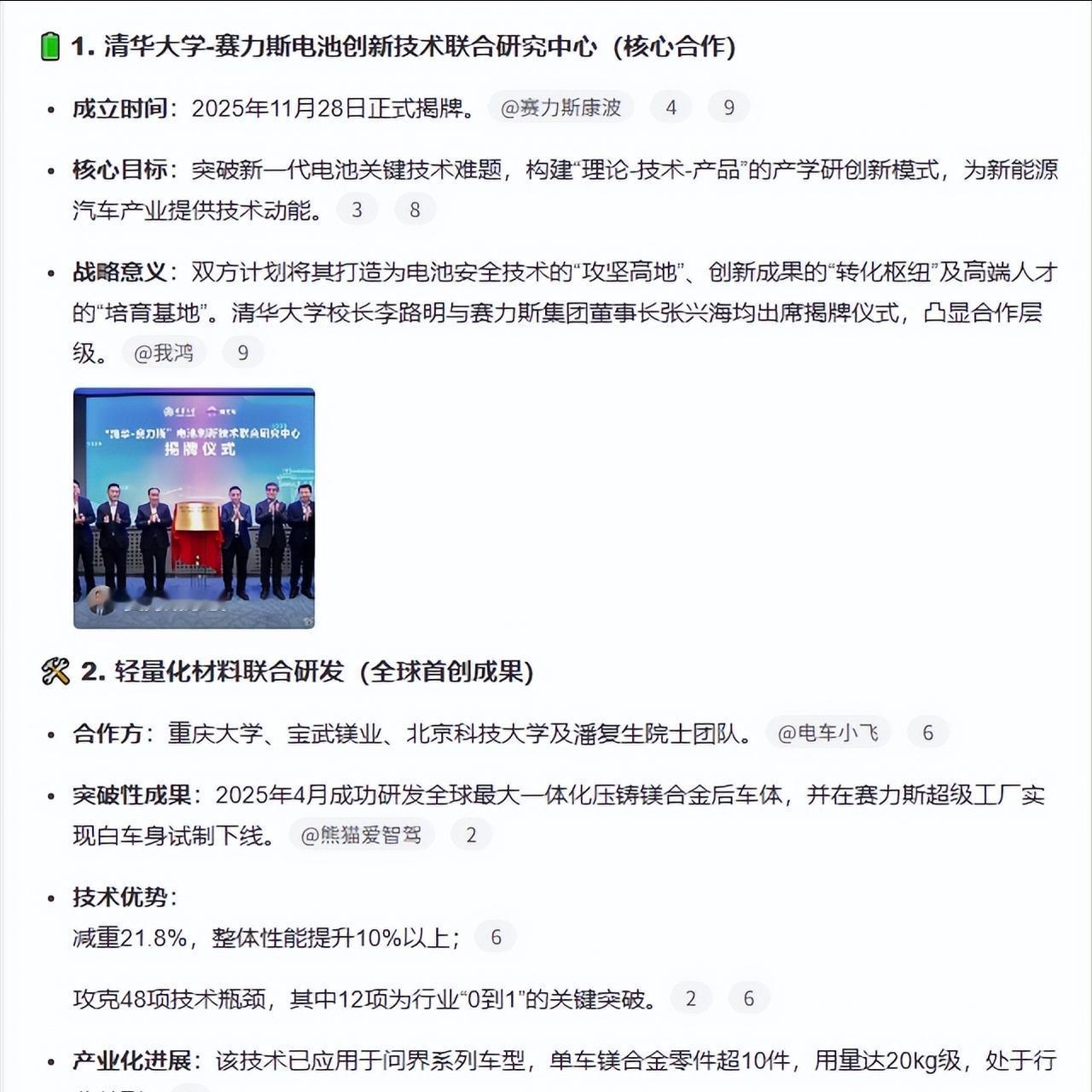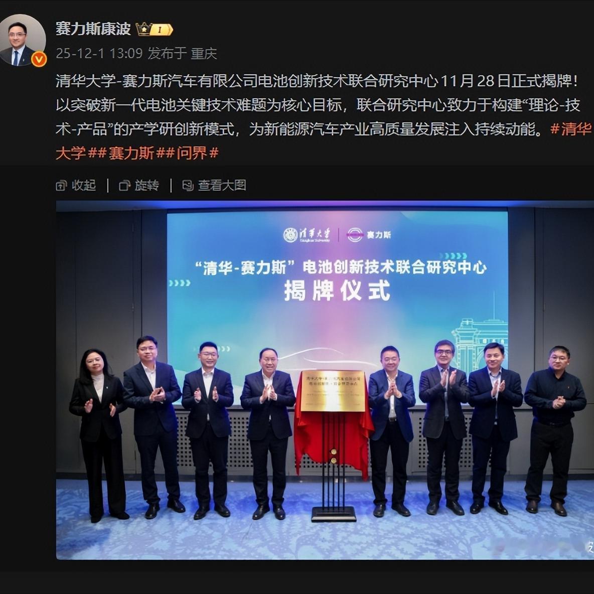 赛力斯越发出息了,竟然能联合清华搞电池技术研究中心! 刚刚,清华大学和赛力斯汽车合作的电池创新技术研究中心在清华大学揭牌,双方致力于打造电池及安全技术的“攻坚高地”、创新成果的“转化枢纽”以及高端人才的“培育基地”,为新能源汽车产业发展和动力电池技术的持续进步提供坚实支撑。 没想到,赛力斯从一个无人问津的小厂,短短几年就做到和清华等顶级大学成立联合研究中心…