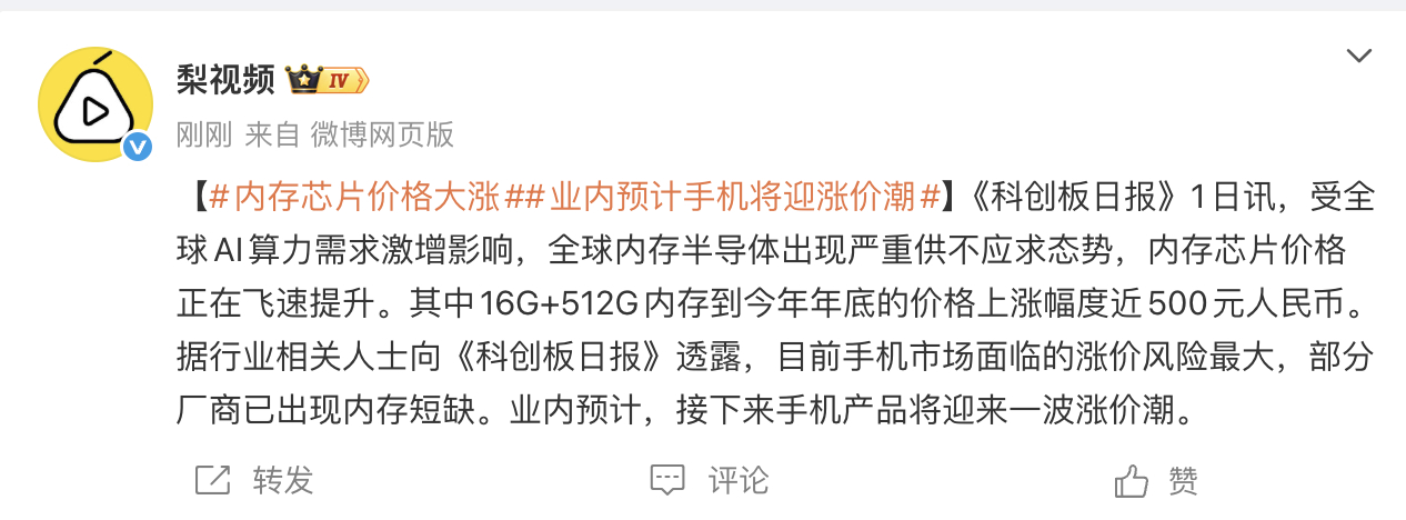 上个月月初找小敌鸽配了台电脑,听说现在涨了不少了…内存芯片价格大涨我有预感之后的新品手机怕是也得涨点,你们觉得呢业内预计手机将迎涨价潮