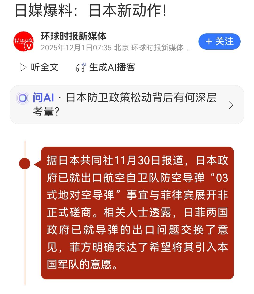 快讯,快讯! 12月1日,据《环球时报》报道,日本除了防务费增加,在武器出口方面又出大动作,已与菲律宾正式展开出口航空自卫队防空导弹“03式地空导弹”事宜加紧磋商,菲购买愿望强烈。11月30日《观察网》报道称,菲律宾爆发大规模反腐抗议,美国彭博社炒作称,菲律宾疲于应对国内诸多危机,很难指望它能全力参与到所谓“对抗中国”的联盟之中。 [狗头]讲几句:杀气来袭,相当危险!在高市“台海出兵”刺激搅动南海局势,“台独”分子叫嚣“永久对抗”之际,日本又军售武器给菲律宾意欲何为?菲律宾又用武器防谁? 看似普通的军售,实则抱团牟利意图明显。日式“03式地空导弹”是日本陆上自卫队装备的中程防空导弹系统,采用末端主动雷达制导+惯性制导,改进型最远射程100公里。虽是短程导弹,但狼子野心昭然若揭,菲律宾与中国南海岛屿大都是隔海相望,特别是距离黄岩岛最近,配合日本企图“出兵”意图也更加明显。 日本、菲律宾和中国台湾正处于美国设计的遏制中国的第一岛链,并且这个“岛链”存在和加固目的就是控制南海航道,“圈死”中国制约中华民族伟大复兴。菲律宾是一只养不熟的啥,即使我国为其受灾提供再多的帮助,也不能摆脱背后“捅刀子”的企图,再加上美国背后“拱火”,使其更加抱团对抗,必须认清形势。 犯我中华者虽远必诛!