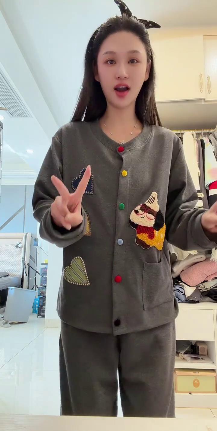 刚卖个发箍完了都要睡衣,那你超不超人?睡衣。姐妹们,特别好穿。它里面是什么?带一点点香,小隆重的感觉,超级亲肤,超级舒服。带一点点羊毛,不是羊毛是不能拿热水洗,容易缩水,洗洗衣机甩也是不能用热水洗。 我给你们念一下布料里都有什么,就是按照自己觉得行再拍。它添加了百分之一的羊毛并不多,有添加一点,但是要用热水也会缩水。还添加了百分之一的桑蚕丝,聚酯纤维和氨纶,还有粘胶纤维。这是一个衣服的材质,还有就是样式,我超喜欢。颜色我也喜欢是灰色,深灰色的那一种。 ·一、这个颜色耐看。 ·二、它还抗脏。 ·三、这个花我也配色我也喜欢。 三个小桃心,一个小狗,小狗按钮还是五颜六色的。其余裤子什么都没有花哨了,就这样式的。上衣稍微带一点点小,这个都是小狗,上衣带一点那种好看的话,裤子又干干净净。我穿的是xl的,按照推荐的尺码拍就可以了。这个加用料不会偏小这那的,如果卡码了可以拍大,因为碎一码舒服一点。如果想穿正好的就按照推荐尺码拍就可以了。