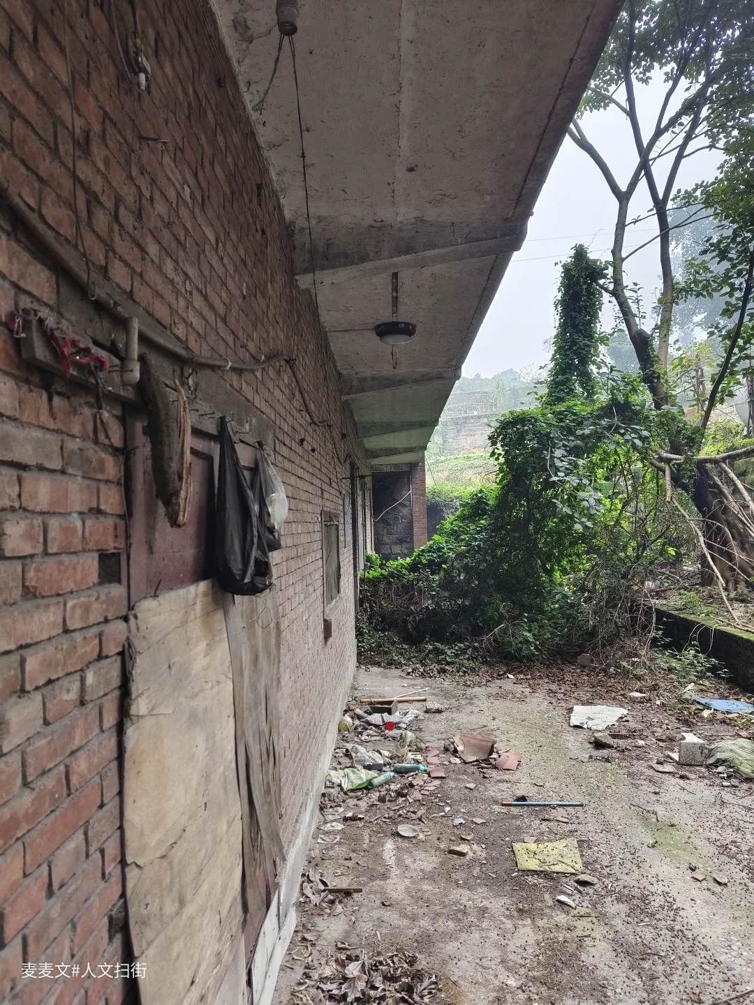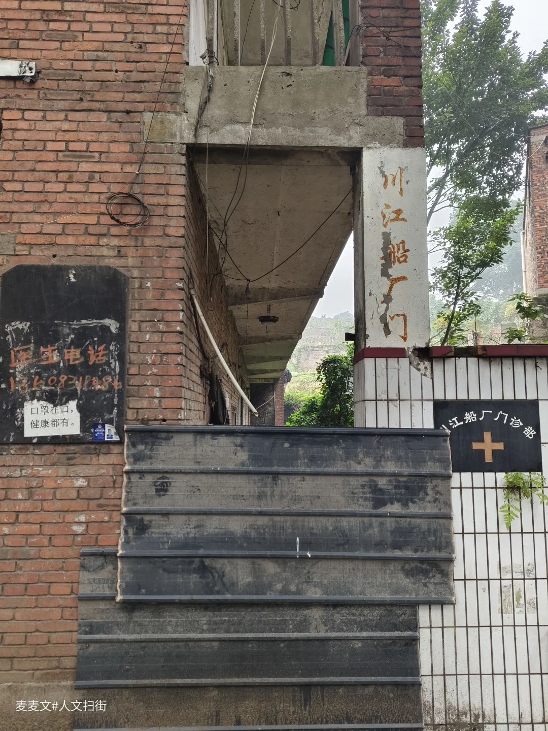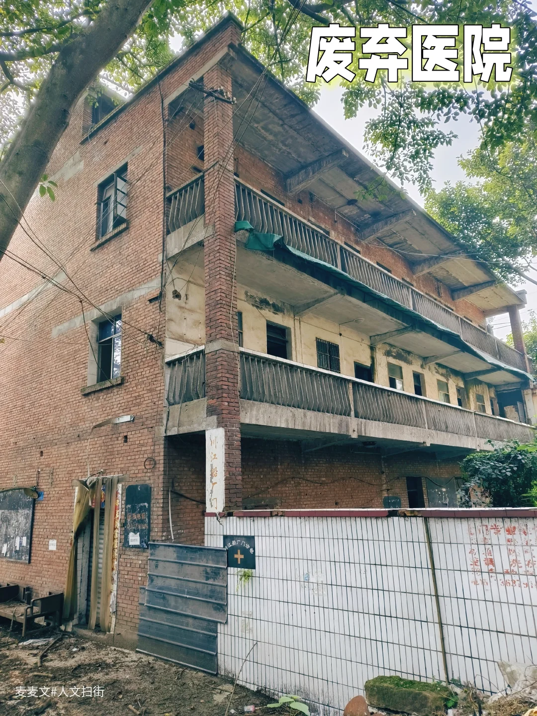 这栋红砖楼曾是川江船厂职工医院,当年厂里职工或家属头疼脑热都往这儿跑,二楼走廊总飘着消毒水混着痱子粉的味儿。 如今栏杆锈成灰,墙皮卷着潮斑往下掉,曾经那扇总敞开的诊室门早已封死。树影晃过空荡的走廊,像没人收的病历本。