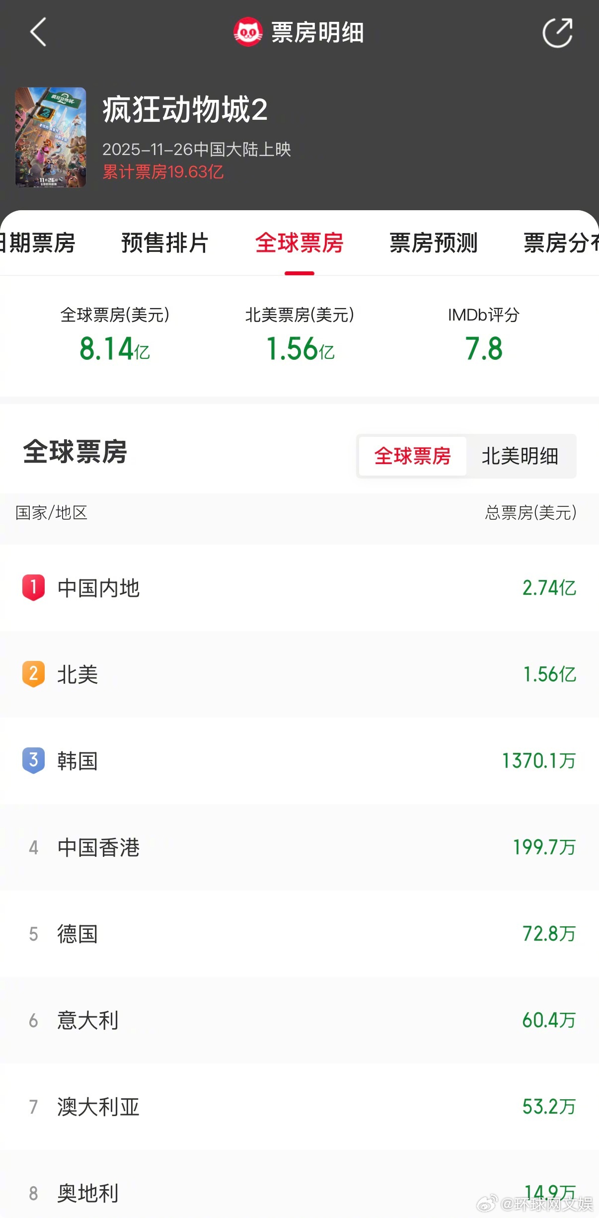 【#疯狂动物城2中国内地票房超北美# 】据猫眼专业版数据,截至11月30日,《疯狂动物城2》上映首周,中国内地票房报收2.74亿美元,超越北美票房成绩,中国内地成为本片全球第一大票仓!你看#疯狂动物城2# 了吗?你觉得好看吗?
