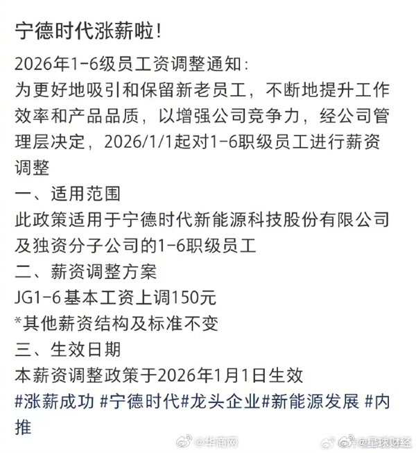 #宁德时代发布涨薪通知#【#宁德时代基层员工每月涨薪150元#】据报道,有网友爆料称,宁德时代近日发布涨薪通知。通知称,为更好地吸引和保留新老员工,不断地提升工作效率和产品品质,以增强公司竞争力,经公司管理层决定,2026/1/1起对1-6职级员工进行薪资调整。一、适用范围此政策适用于宁德时代新能源科技股份有限公司及独资分子公司的1-6职级员工。二、薪资调整方案JG1-6基本工资上调150元,其他薪资结构及标准不变。三、生效日期本薪资调整政策于2026年1月1日生效。据了解,此次宁德时代涨薪涉及的员工职级为基层员工。而宁德时代去年财报显示,公司全体员工数为13.2万人,人均薪酬为23.63万元,较2023年上涨1.06万元。此外,宁德时代2025年三季度财报显示,2025前三季度,公司营收2831亿元,同比增长9.28%;归母净利润490亿元,同比增长36.20%。业绩方面,今年1-9月,宁德时代以210.67GWh的累计装车量、42.75%的市场份额稳居榜首,为国内乃至全球最大的动力电池供应商。(快科技)